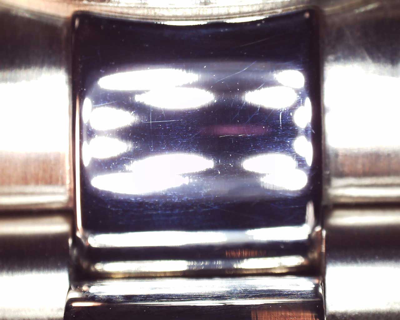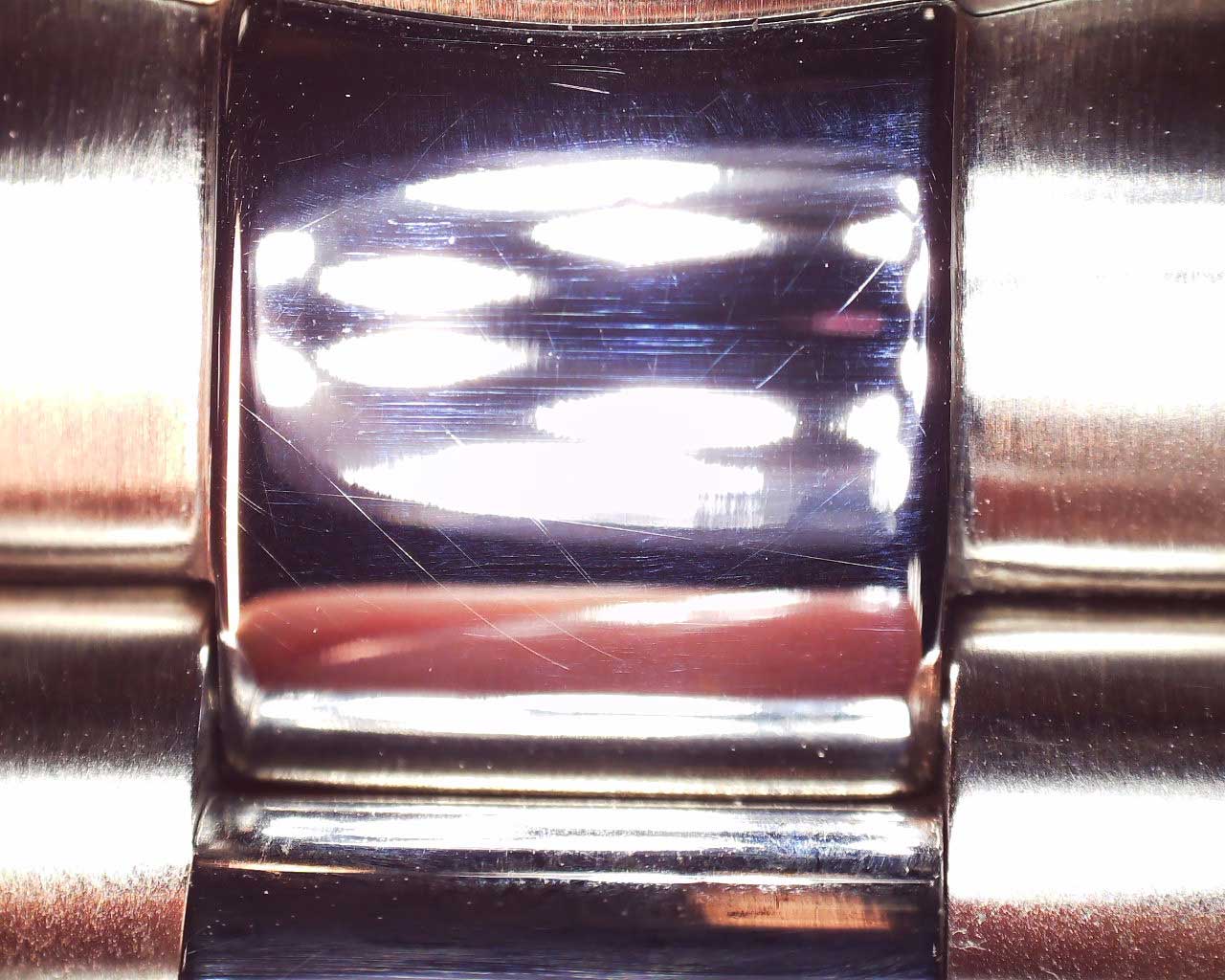 Прямоугольные стрелки в стиле Baton. Стрелки и метки с люминесцентным покрытием, которое светится в темноте после непродолжительной зарядки на свету. Рифленая заводная головка. Стальной браслет с матовой и полированной отделкой. Раскладывающаяся застежка.