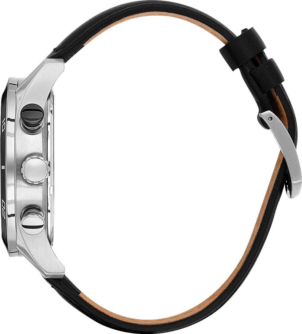 12-ти и 24-х часовой формат времени, второй часовой пояс и день недели отображаются на отдельных циферблатах. Рифленая заводная головка. Завинчивающаяся задняя крышка. Удобный кожаный ремешок с классической застежкой.