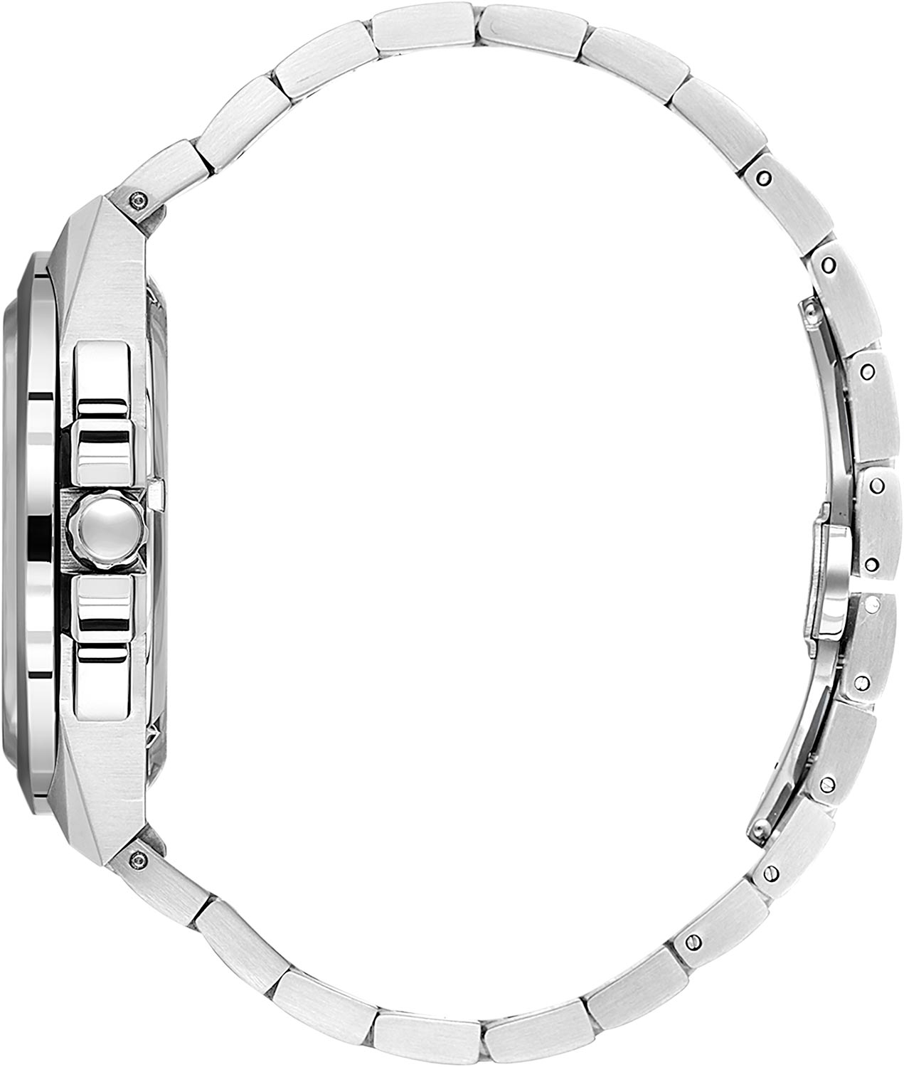 Заостренные прямоугольные стрелки в стиле Baton с люминесцентным покрытием, которое светится в темноте после непродолжительной зарядки на свету. Рифленая заводная головка с защитой. Надежный стальной браслет с матовой отделкой. Раскладывающаяся застежка.