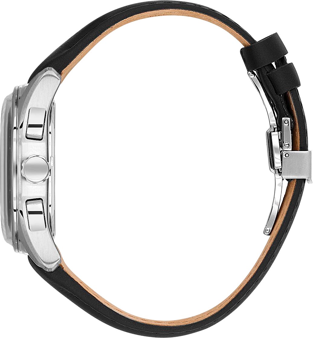 Окошко даты находится между отметками 4 и 5 часов. Заостренные прямоугольные стрелки в стиле Baton с люминесцентным покрытием, которое светится в темноте после непродолжительной зарядки на свету. Рифленая заводная головка. Удобный ремешок из натуральной кожи с раскладывающейся застежкой.