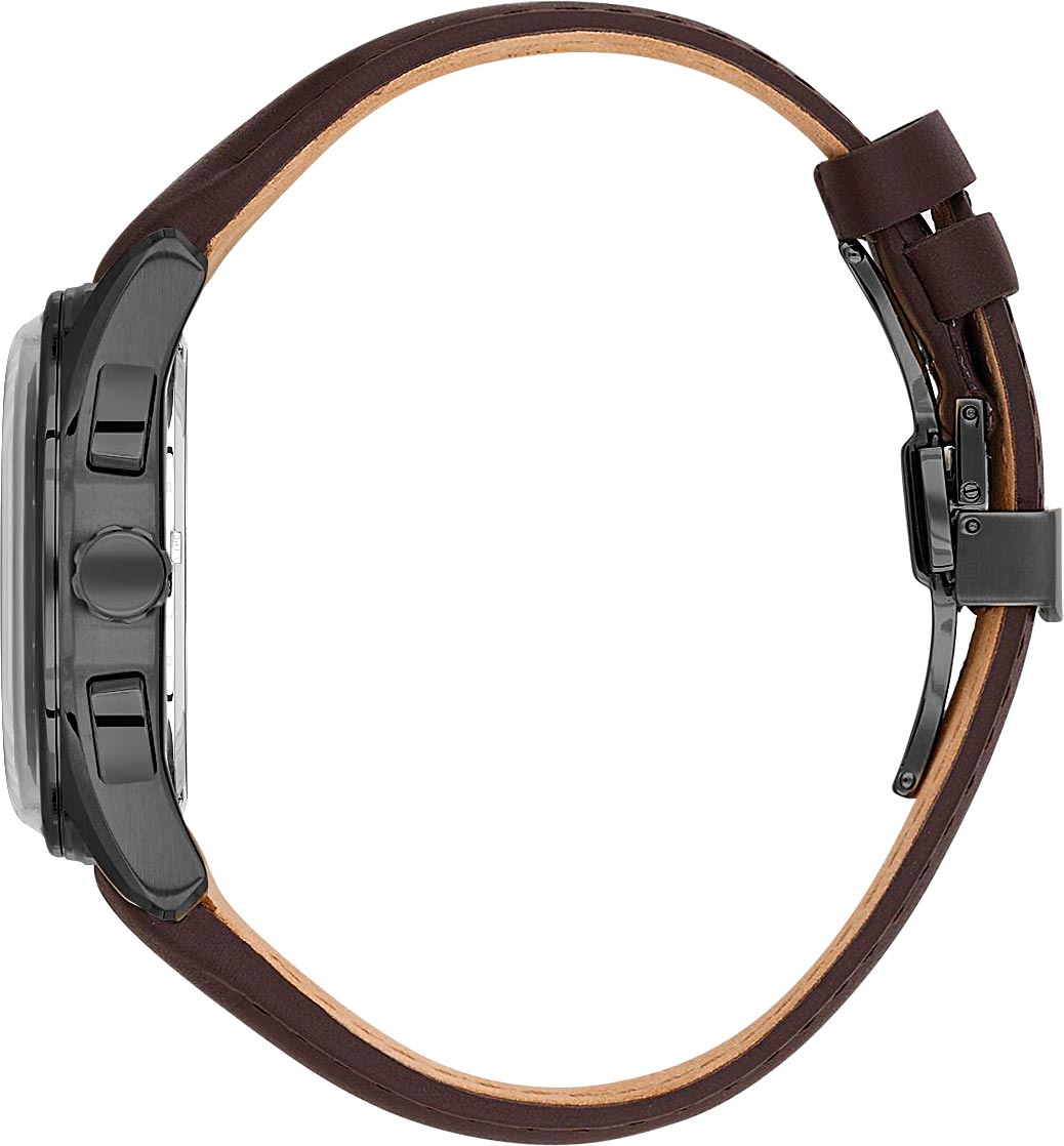 Окошко даты находится между отметками 4 и 5 часов. Заостренные прямоугольные стрелки в стиле Baton с люминесцентным покрытием, которое светится в темноте после непродолжительной зарядки на свету. Рифленая заводная головка. Удобный ремешок из натуральной кожи с раскладывающейся застежкой.