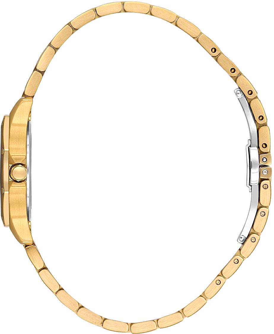 Женские наручные часы. Круглый стальной корпус с накладным безелем с матовой обработкой, украшенным декоративными болтами. Циферблат выполнен по технологии Sunray (солнечные лучи) и украшен фирменным логотипом. Накладные метки в виде точек, украшенных кристаллами.