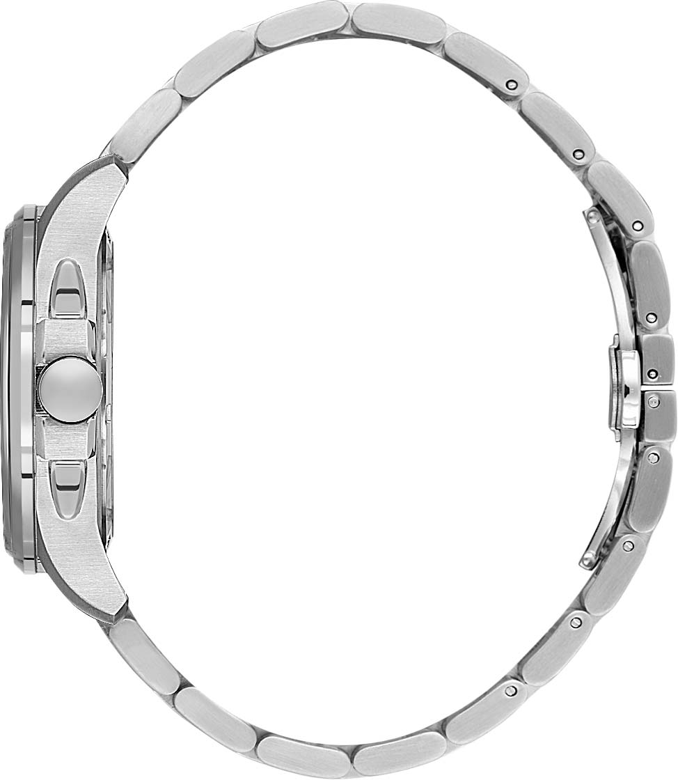 Функциональные наручные мужские часы. Круглый стальной корпус с матовой и полированной отделкой. 12-ти и 24-х часовой формат времени. Дата и день недели вынесены на отдельные циферблаты. Циферблат с узором украшен фирменным логотипом. Накладные метки в виде штрихов. Гладкая заводная головка с защитой. Надежный стальной браслет с матовой отделкой. Раскладывающаяся застежка.