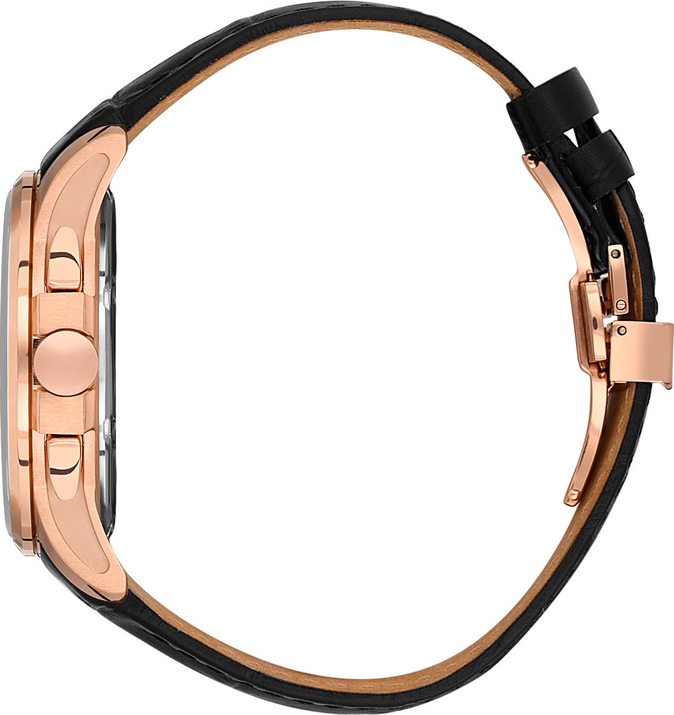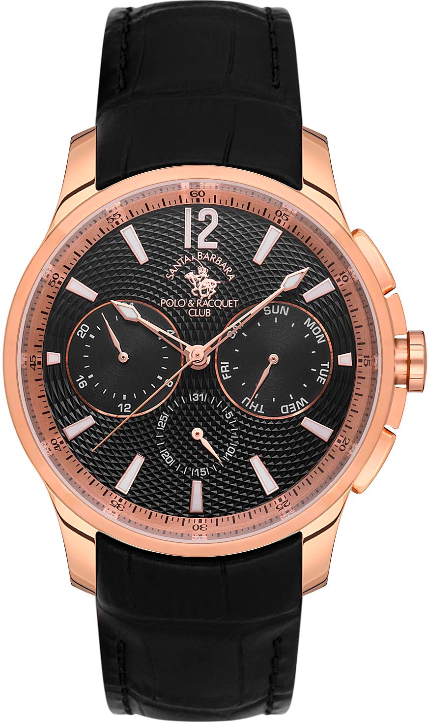 Функциональные наручные мужские часы. Круглый стальной корпус с матовой и полированной отделкой. 12-ти и 24-х часовой формат времени. Дата и день недели вынесены на отдельные циферблаты. Циферблат с узором украшен фирменным логотипом. Накладные метки в виде штрихов. Гладкая заводная головка с защитой. Удобный кожаный ремешок с раскладывающейся застежкой.