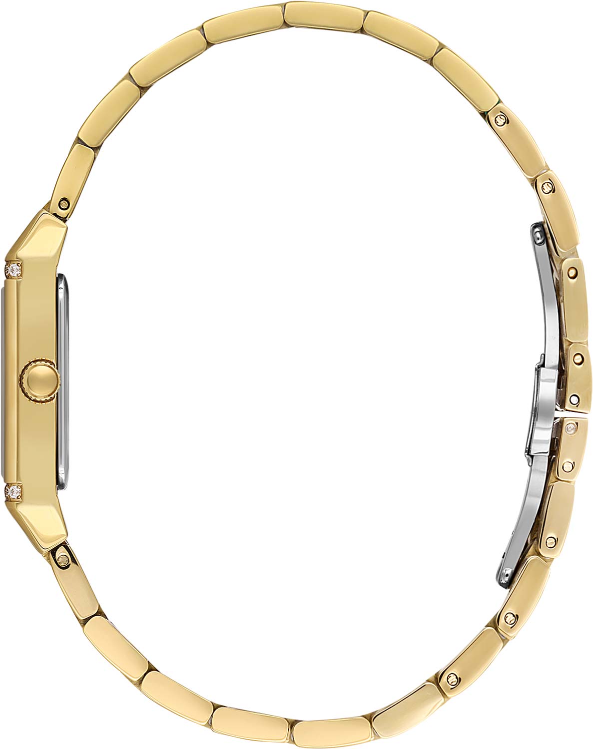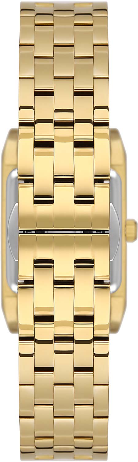 Изящные наручные женские часы. Прямоугольный стальной корпус украшен двумя рядами кристаллов. Циферблат выполнен по технологии Sunray (солнечные лучи) и украшен фирменным логотипом. Накладные метки в виде штрихов и римских цифр. Прямоугольные стрелки. Рифленая заводная головка. Надежный стальной браслет с полированной отделкой. Раскладывающаяся застежка.