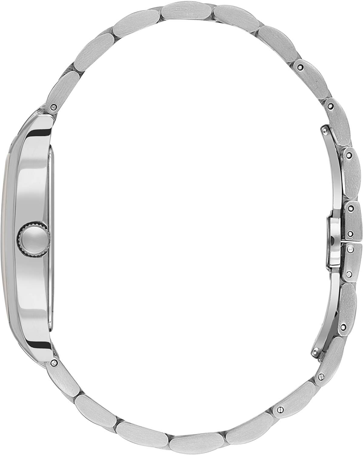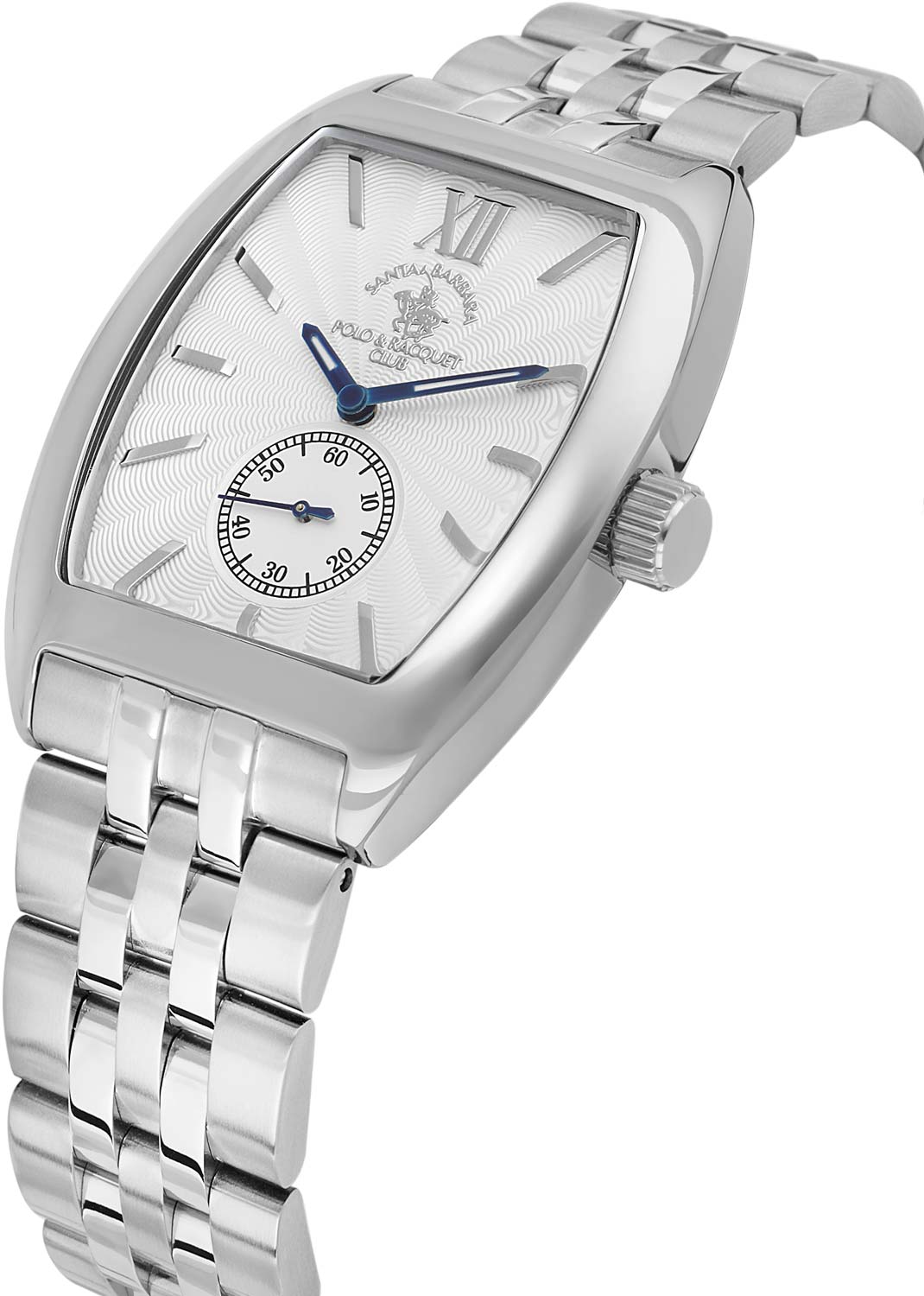 Миниатюрные наручные женские часы. Стальной корпус в форме бочки с полированной отделкой. Циферблат украшен фирменным логотипом. Секундная стрелка вынесена на отдельный циферблат. Накладные метки в виде штрихов и римской цифры XII. Стальной браслет с матовой и полированной отделкой. Рифленая заводная головка. Раскладывающаяся застежка.