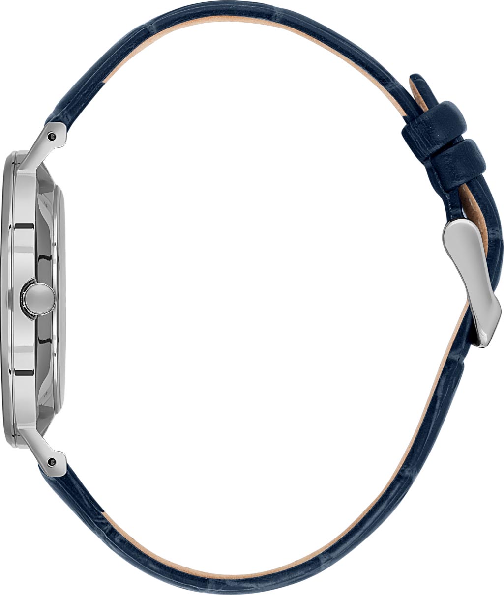 Окошко даты находится в положении 6 часов. Указатель фазы Луны. Стрелки в стиле Breguet. Заводная головка в форме болта. Удобный кожаный ремешок с классической застежкой.