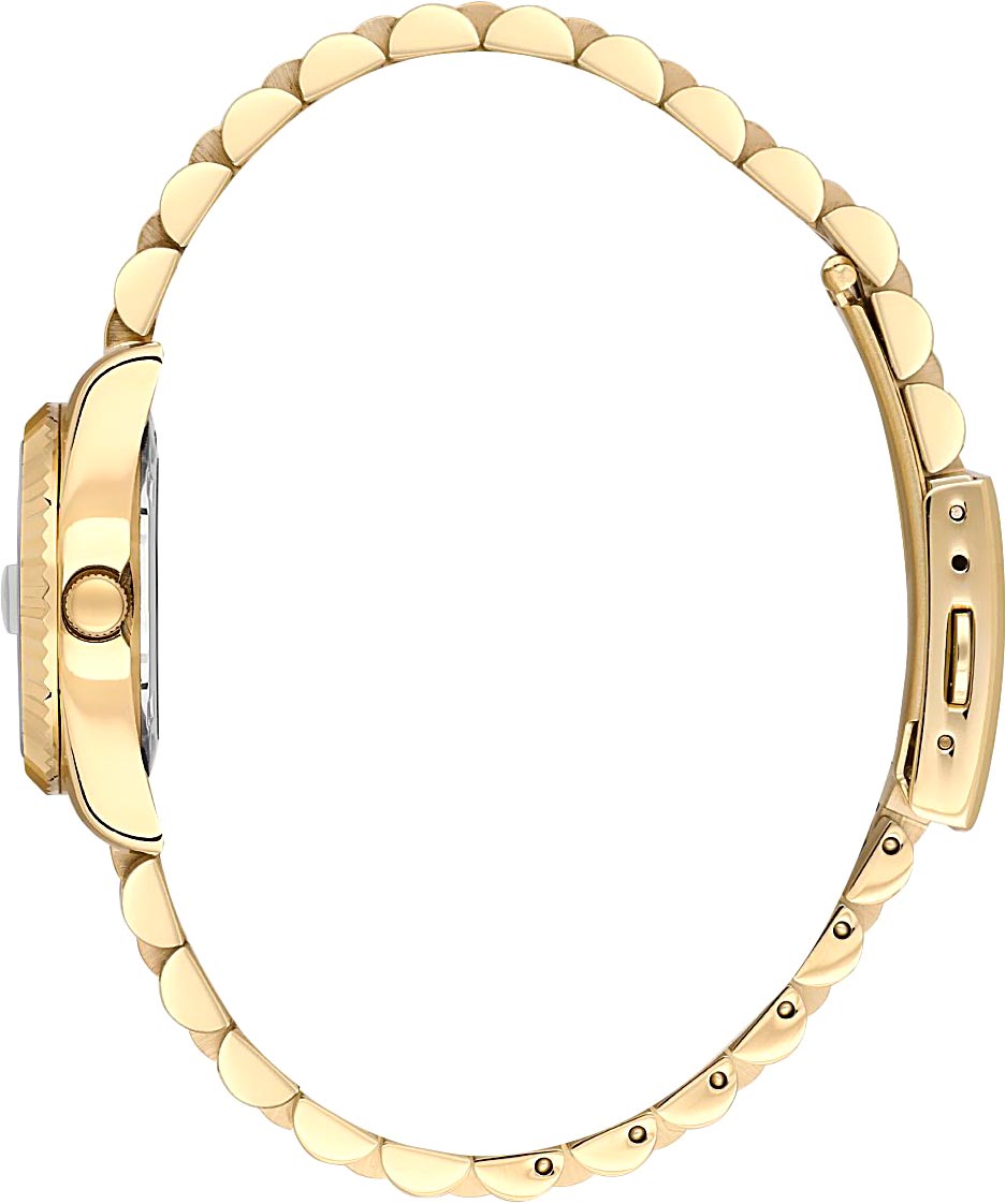 Женские наручные часы. Круглый стальной корпус с матовой и полированной отделкой. Декоративный рифленый безель. Перламутровый циферблат с фирменным логотипом. Накладные метки в виде точек, украшенных кристаллами. Прямоугольные стрелки в стиле Baton.