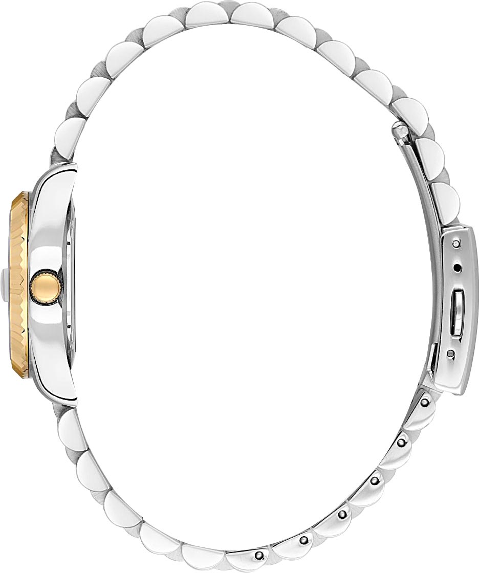 Женские наручные часы. Круглый стальной корпус с матовой и полированной отделкой. Декоративный рифленый безель. Перламутровый циферблат с фирменным логотипом. Накладные метки в виде точек, украшенных кристаллами. Прямоугольные стрелки в стиле Baton.