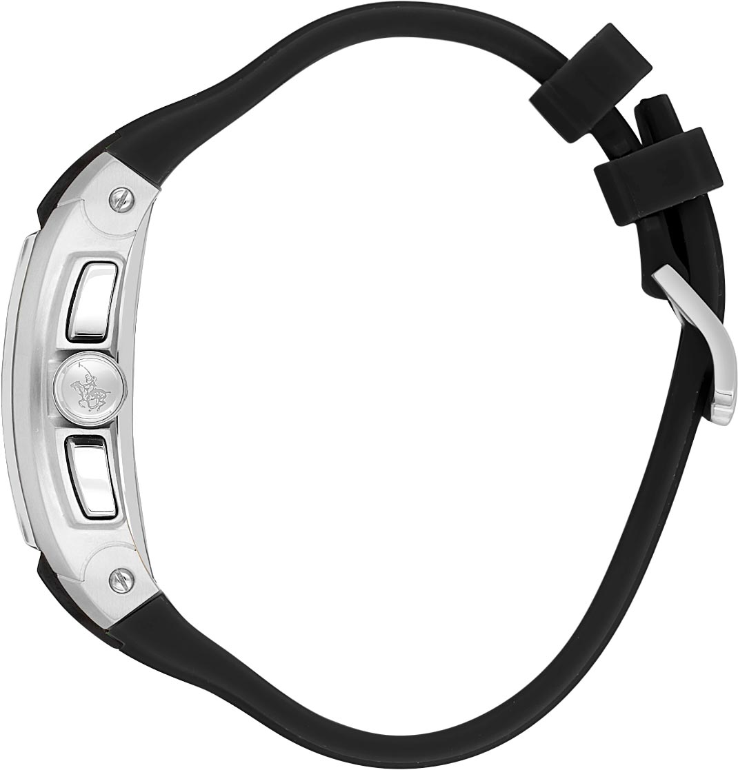 Наручные кварцевые мужские часы. Стальной корпус в форме бочки. Декоративный безель. Двухуровневый циферблат украшен фирменным логотипом. Накладные метки в виде штрихов. 12-ти и 24-х часовой формат времени. Дата и день недели вынесены на отдельные циферблаты.