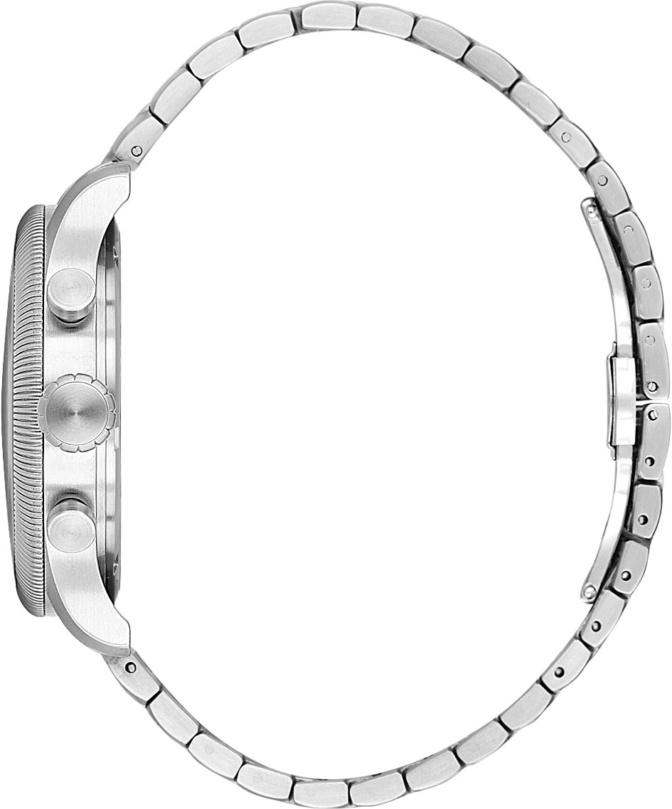 Многофункциональные мужские часы-хронограф с секундомером и тахиметром. Стальной корпус с матовой отделкой. Декоративный рифленый безель. 12-ти и 24-х часовой формат времени. Окошко даты находится между отметками 4 и 5 часов. Матовый циферблат украшен фирменным логотипом.