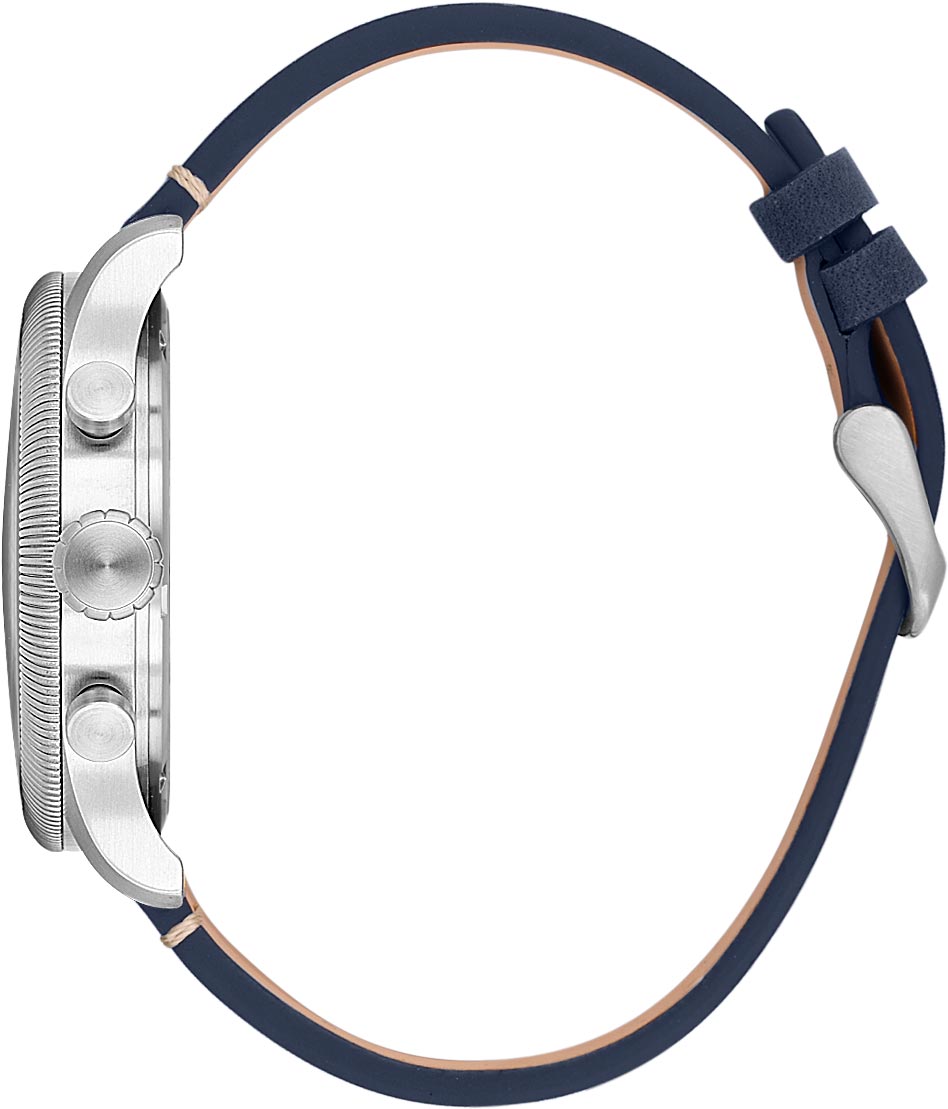 Многофункциональные мужские часы-хронограф с секундомером и тахиметром. Стальной корпус с матовой отделкой. Декоративный рифленый безель. 12-ти и 24-х часовой формат времени. Окошко даты находится между отметками 4 и 5 часов. Матовый циферблат украшен фирменным логотипом.