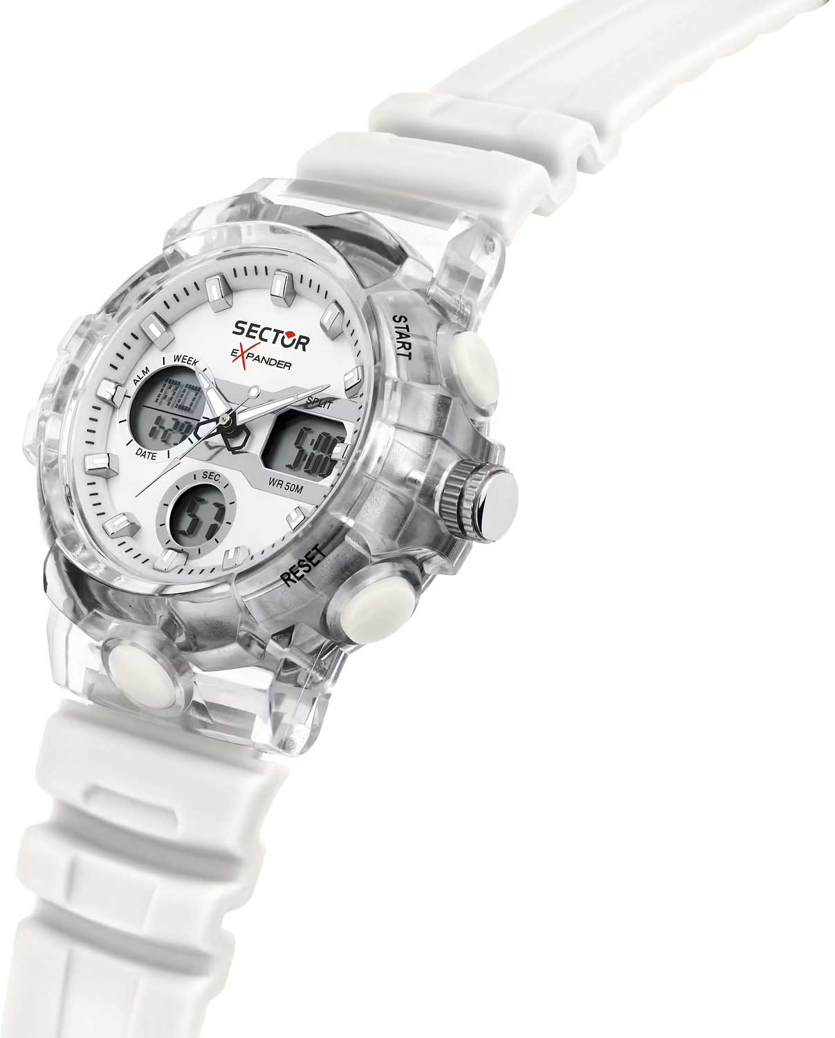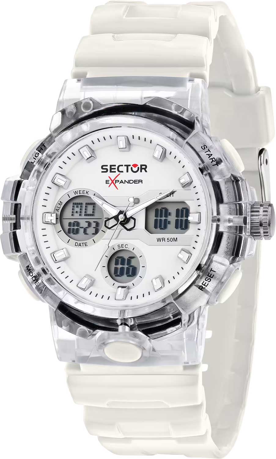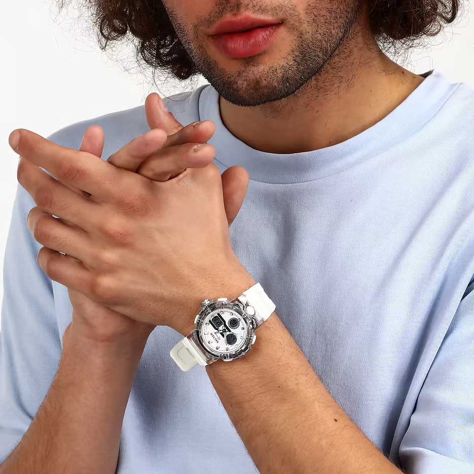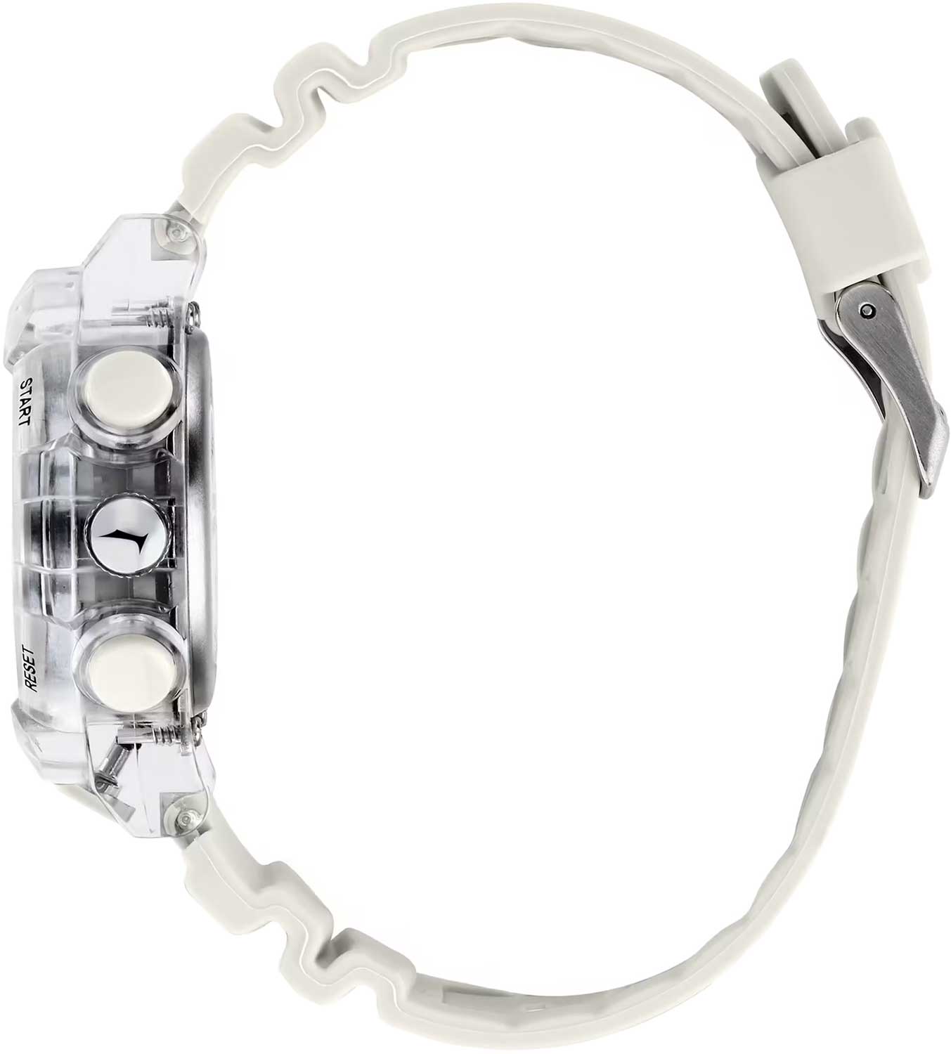 Ex-46. Унисекс часы. Аналогово-цифровые часы с секундомером. SPLIT-хронограф. Корпус выполнен из прозрачного пластика. Циферблат с метками в виде штрихов. Стальная задняя крышка крепится на 4-х винтах. Ремешок с классической застежкой.
