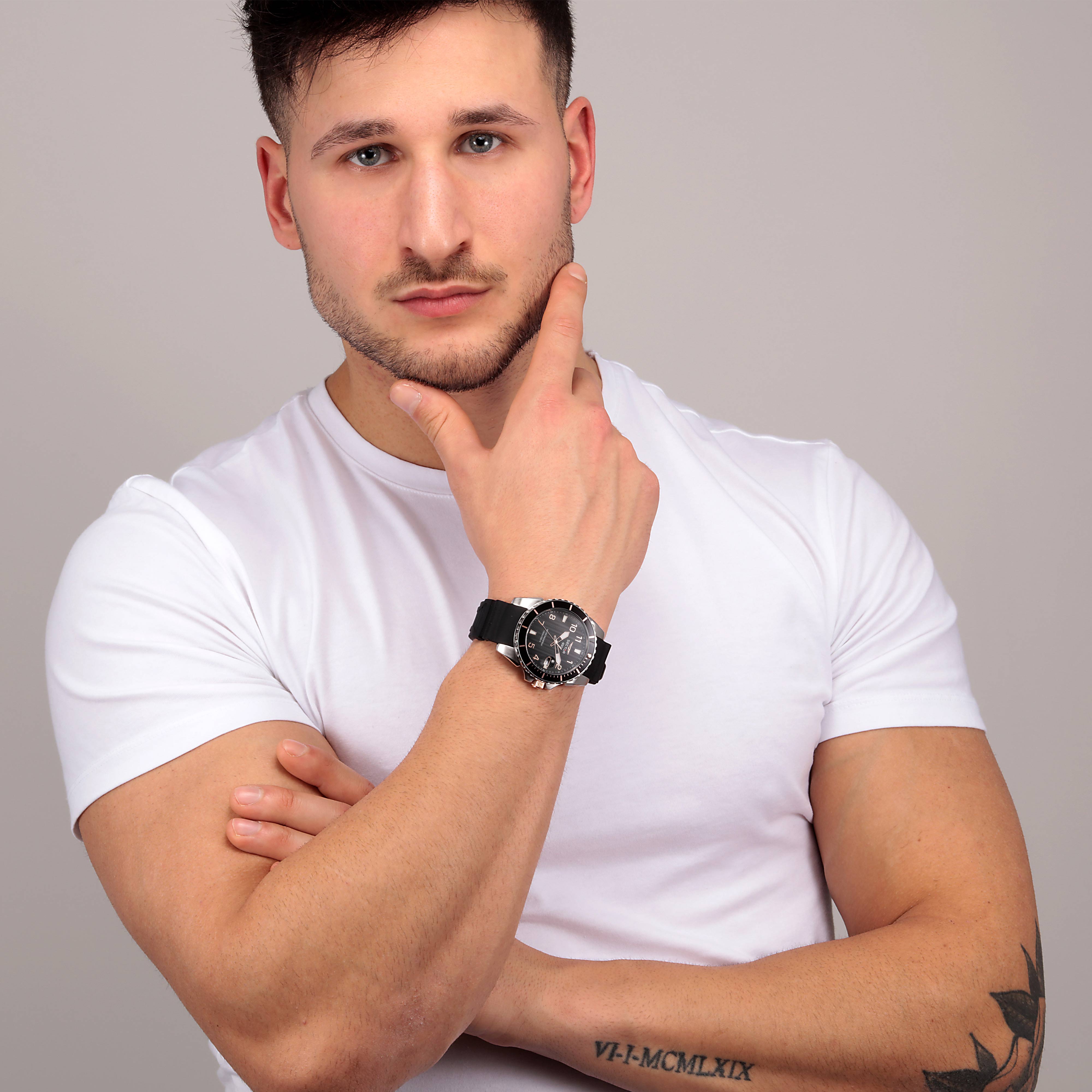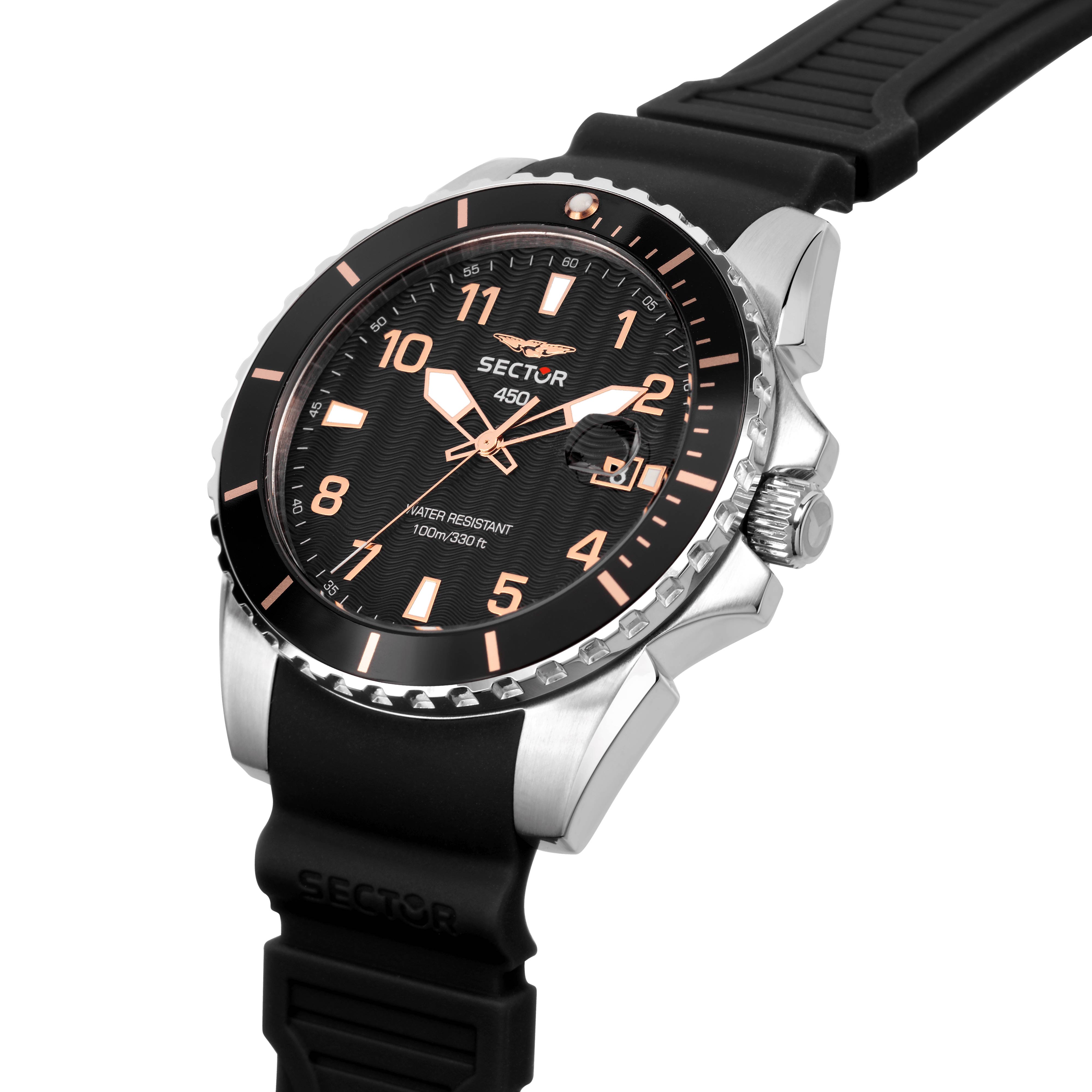 Спортивные часы для мужчин, предпочитающих надежность, точность и практичность. 450. Метки в виде штрихов и арабских цифр. Окошко даты с увеличительным стеклом. Заводная головка с защитой. Ремешок с классической застежкой.