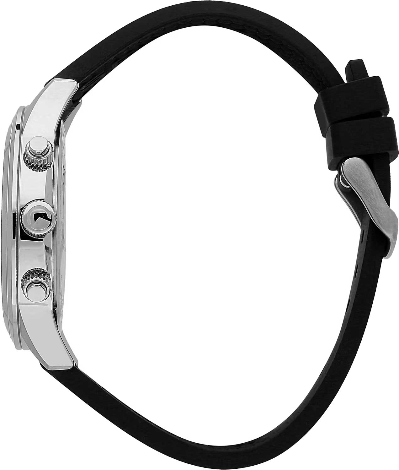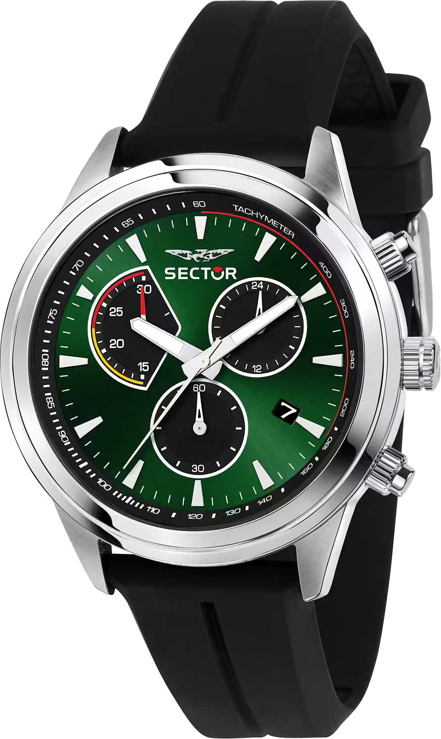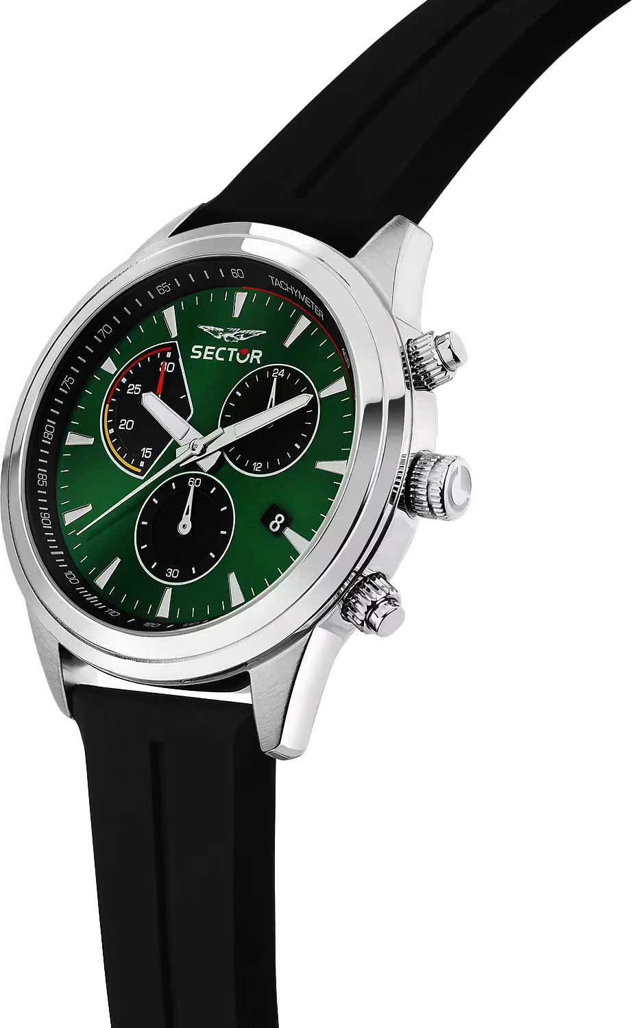 Часы-хронограф с секундомером и тахиметром. Ретроградный указатель минут хронографа до 30мин. 12-ти и 24-х часовой формат времени. Циферблат с метками в виде штрихов выполнен по технологии Sunray (солнечные лучи). Окошко даты находится в положении 4 часа. Ремешок с классической застежкой.