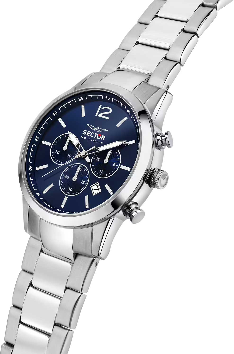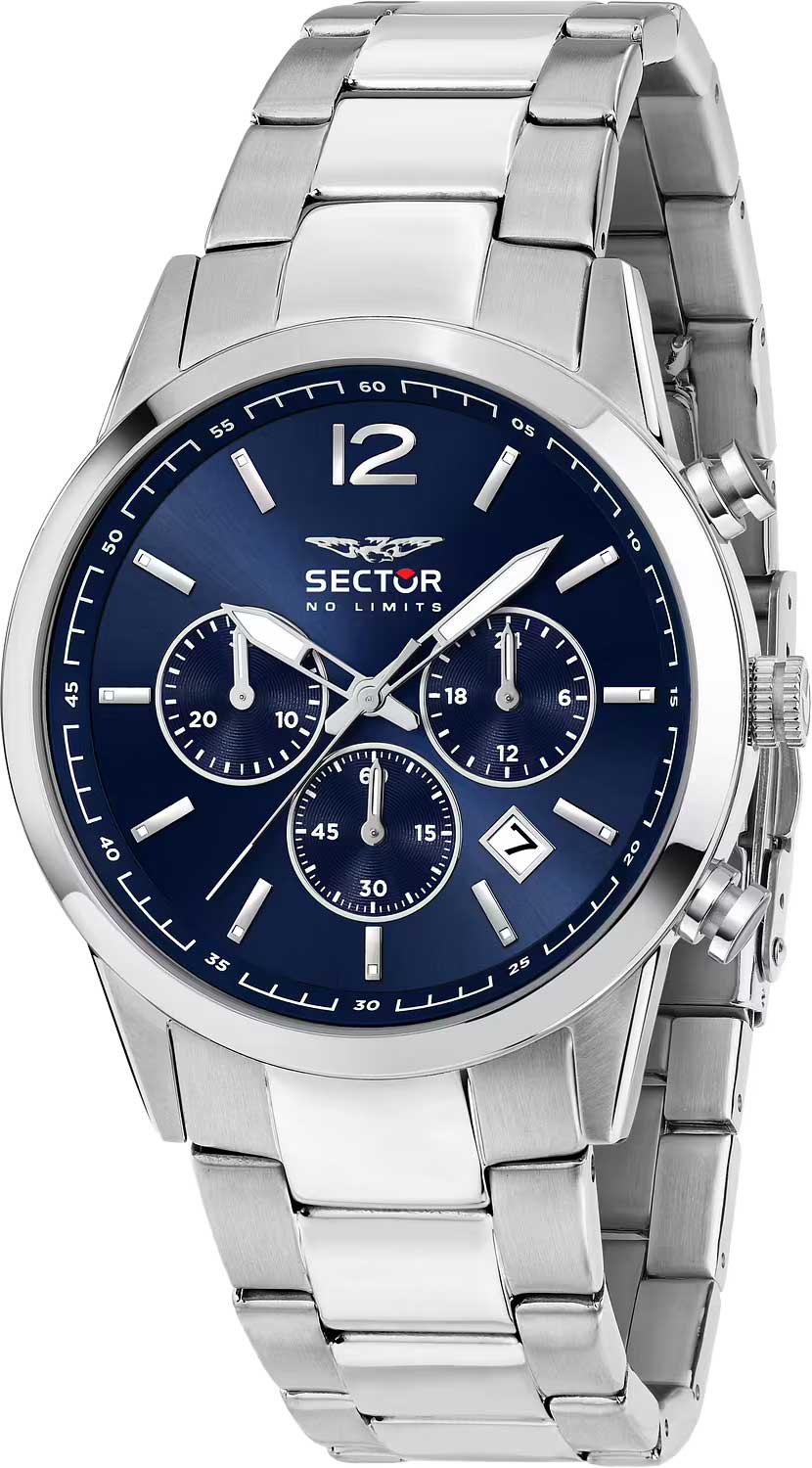 Часы-хронограф с секундомером. 12-ти и 24-х часовой формат времени. Циферблат выполнен по технологии Sunray (солнечные лучи). Метки в виде штрихов и арабской цифры 12. Окошко даты находится в положении между отметками 4 и 5 часов. Браслет с раскладывающейся застежкой. Застежка с системой блокировки.