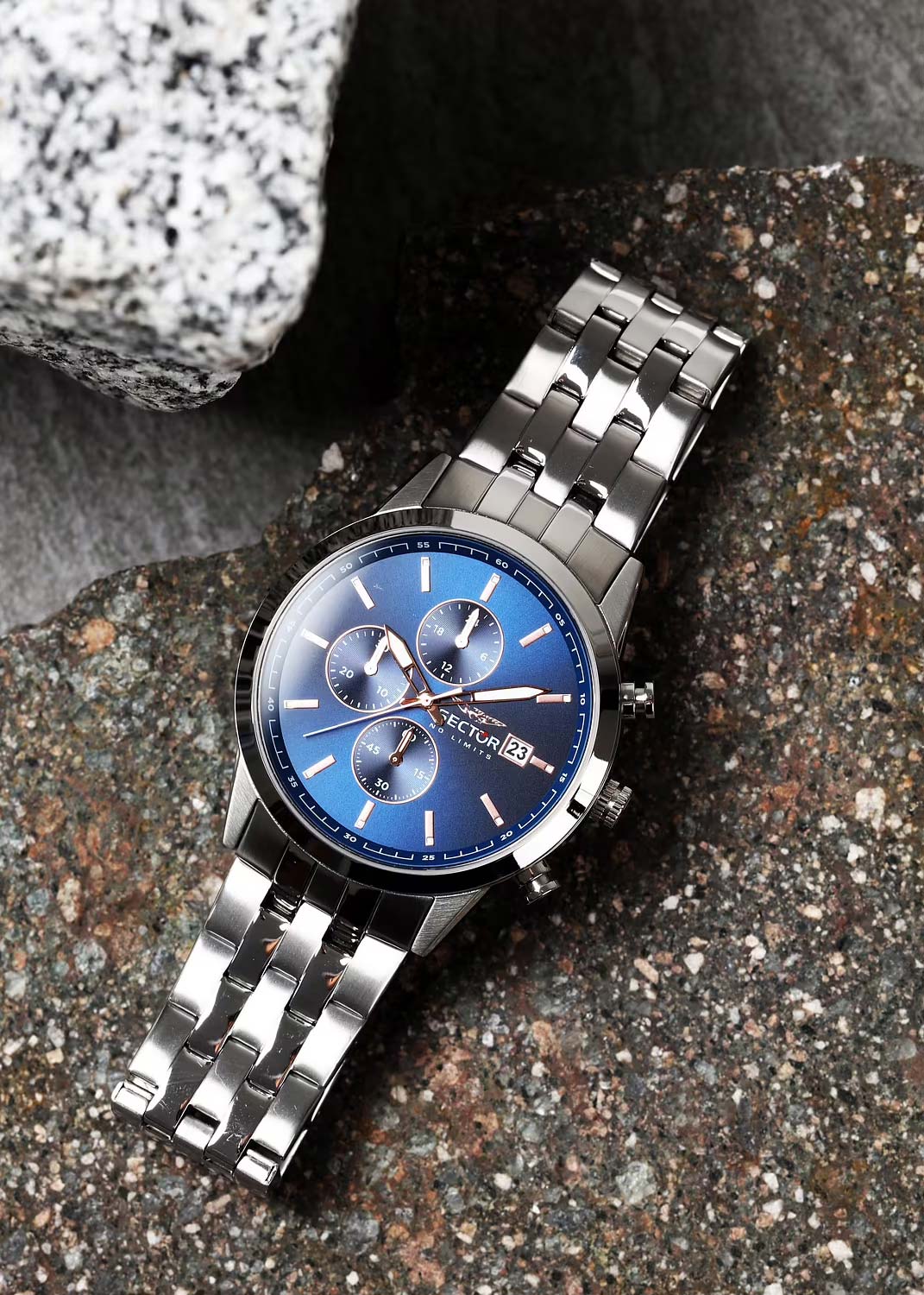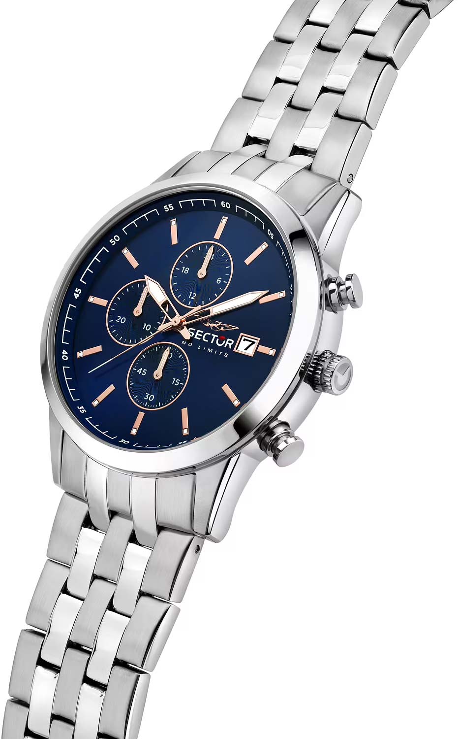 Часы-хронограф с секундомером. 12-ти и 24-х часовой формат времени. Циферблат выполнен по технологии Sunray (солнечные лучи). Метки в виде штрихов. Окошко даты находится на отметке 3 часа. Браслет с раскладывающейся застежкой. Застежка с системой блокировки.