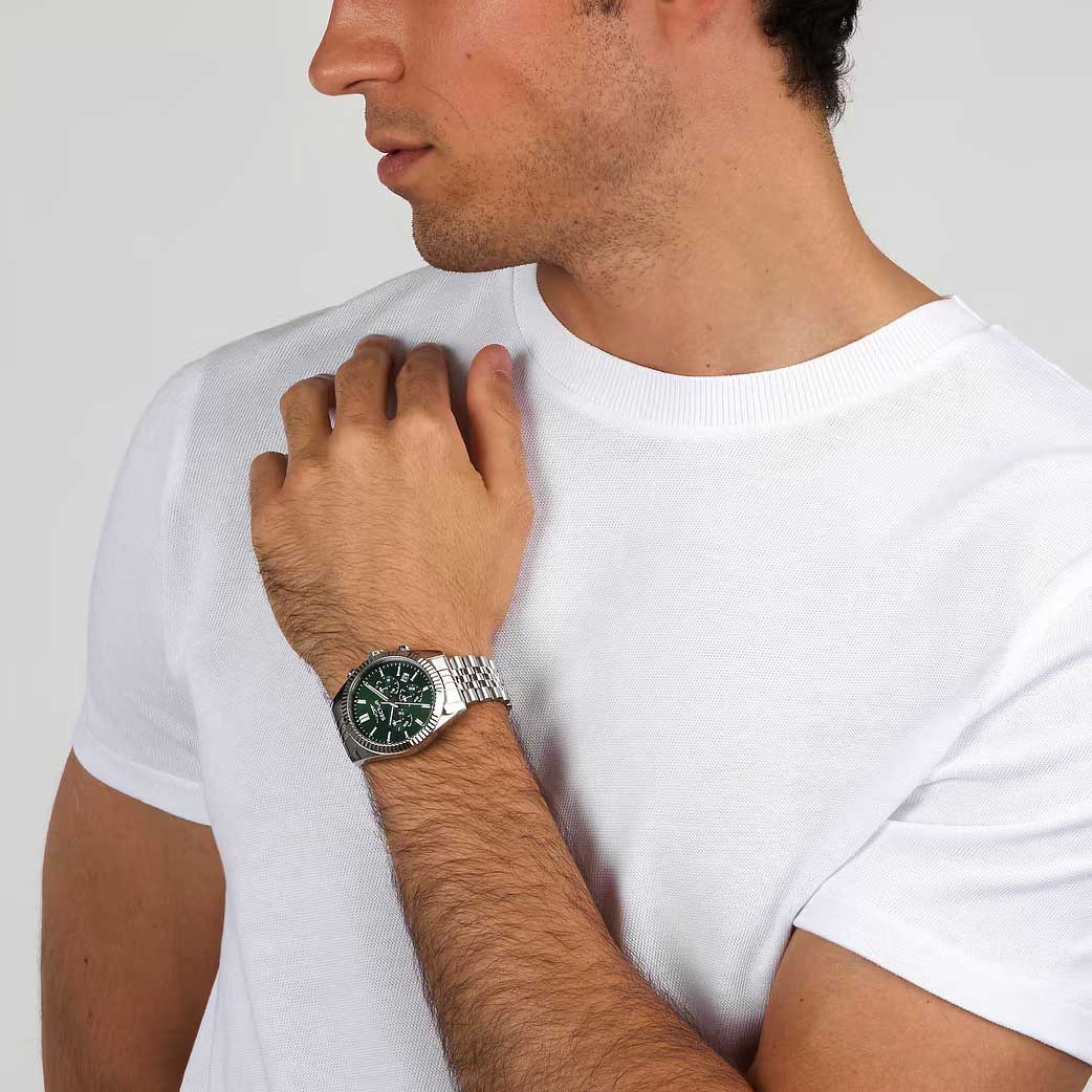 Часы-хронограф с секундомером. 12-ти и 24-х часовой формат времени. Циферблат выполнен по технологии Sunray (солнечные лучи). Метки в виде штрихов. Окошко даты находится в положении между отметками 4 и 5 часов. Рифленый безель. Браслет с раскладывающейся застежкой. Застежка с системой блокировки.