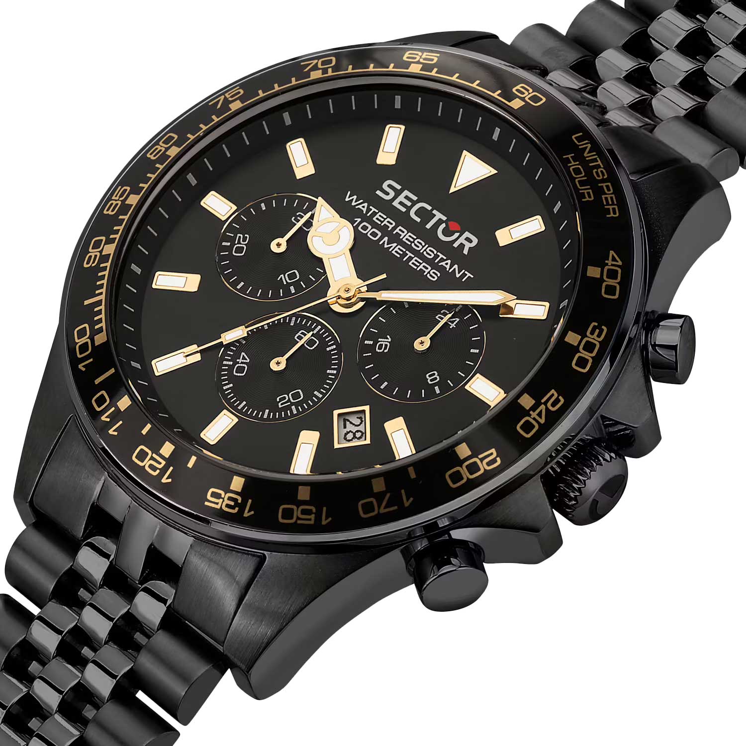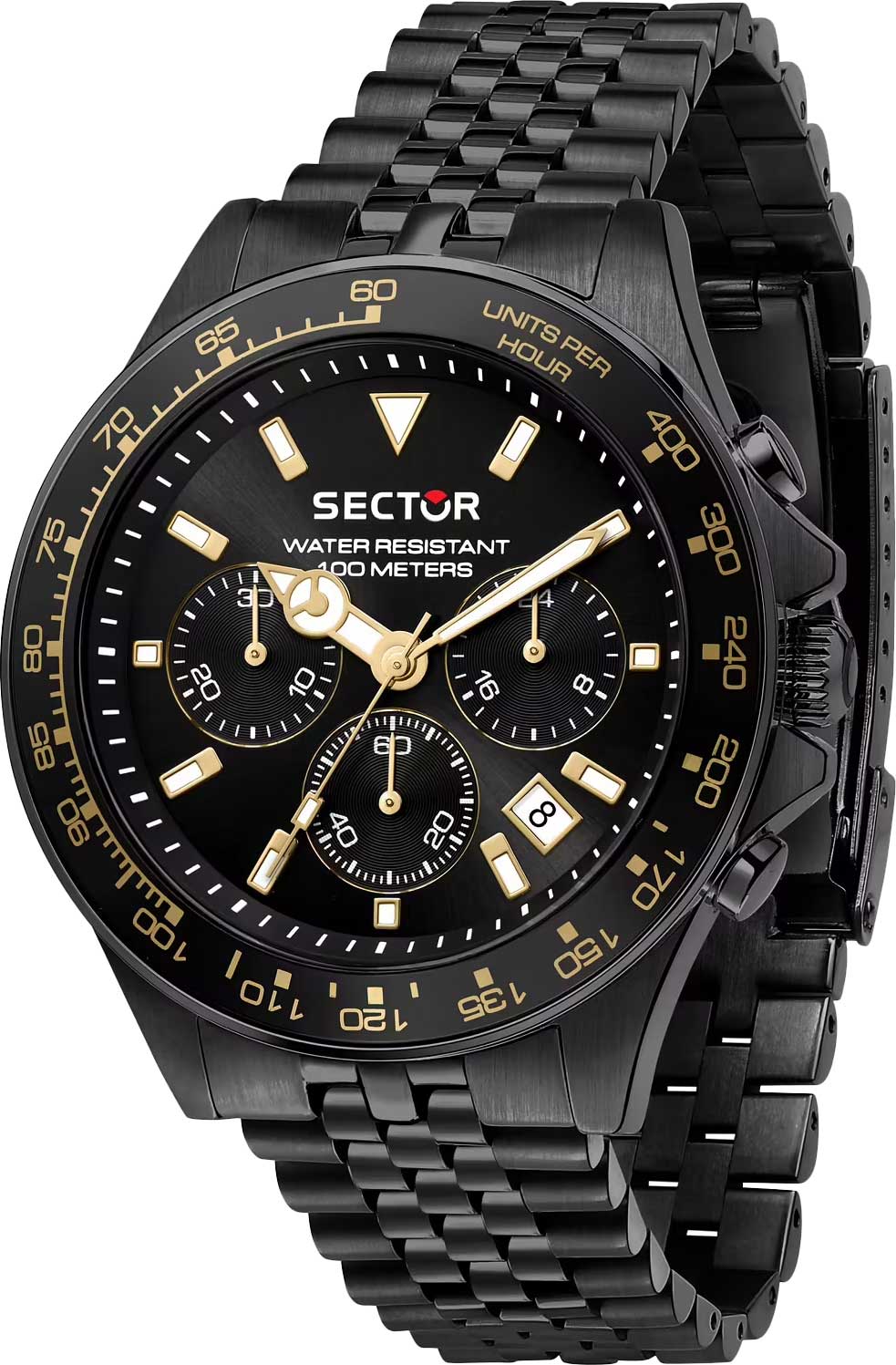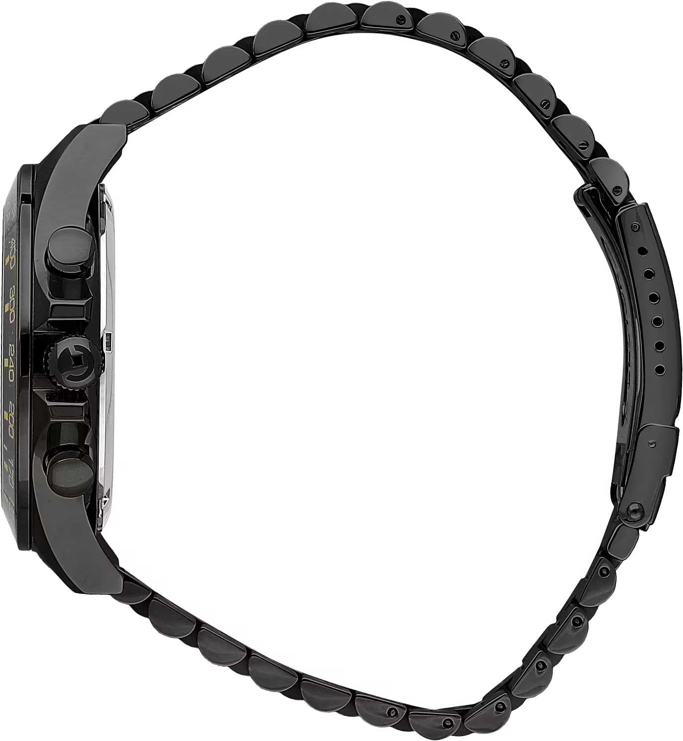 Часы-хронограф с секундомером и тахиметром. 12-ти и 24-х часовой формат времени. Циферблат с метками в виде штрихов выполнен по технологии Sunray (солнечные лучи). Окошко даты находится в положении между отметками 4 и 5 часов. Заводная головка с защитой. Браслет с раскладывающейся застежкой. Застежка с системой блокировки.