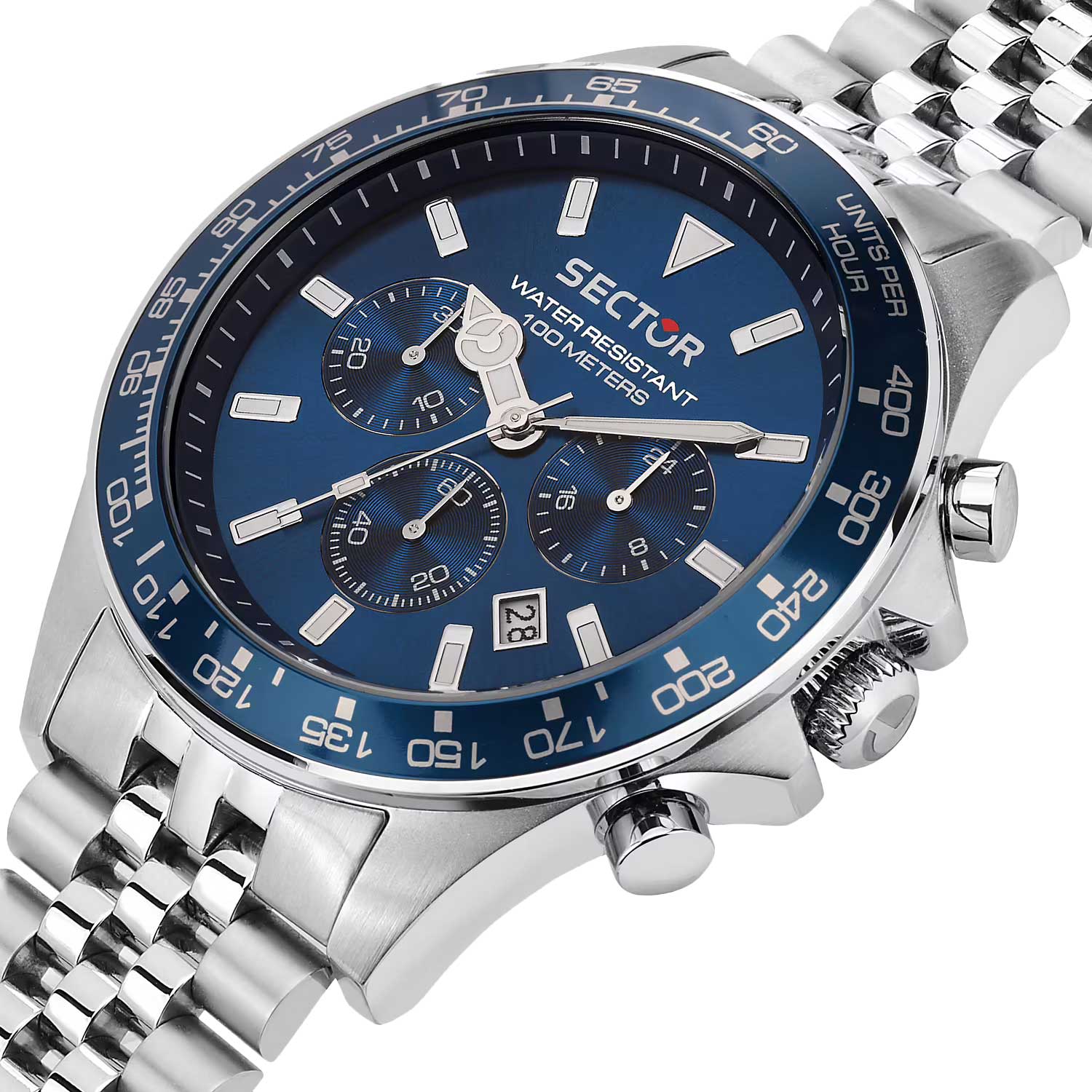 Часы-хронограф с секундомером и тахиметром. 12-ти и 24-х часовой формат времени. Циферблат с метками в виде штрихов выполнен по технологии Sunray (солнечные лучи). Окошко даты находится в положении между отметками 4 и 5 часов. Заводная головка с защитой. Браслет с раскладывающейся застежкой. Застежка с системой блокировки.