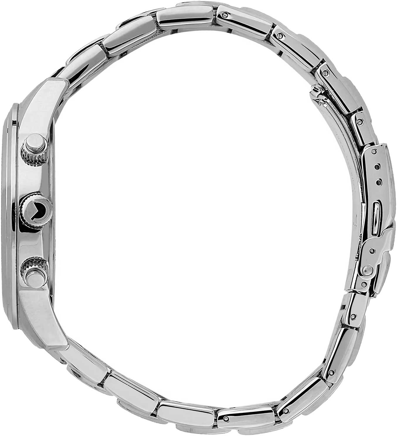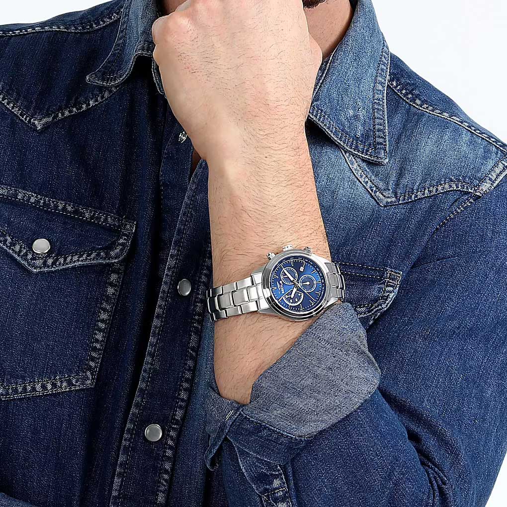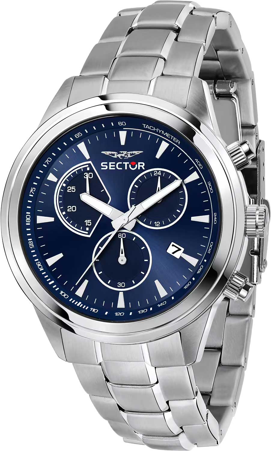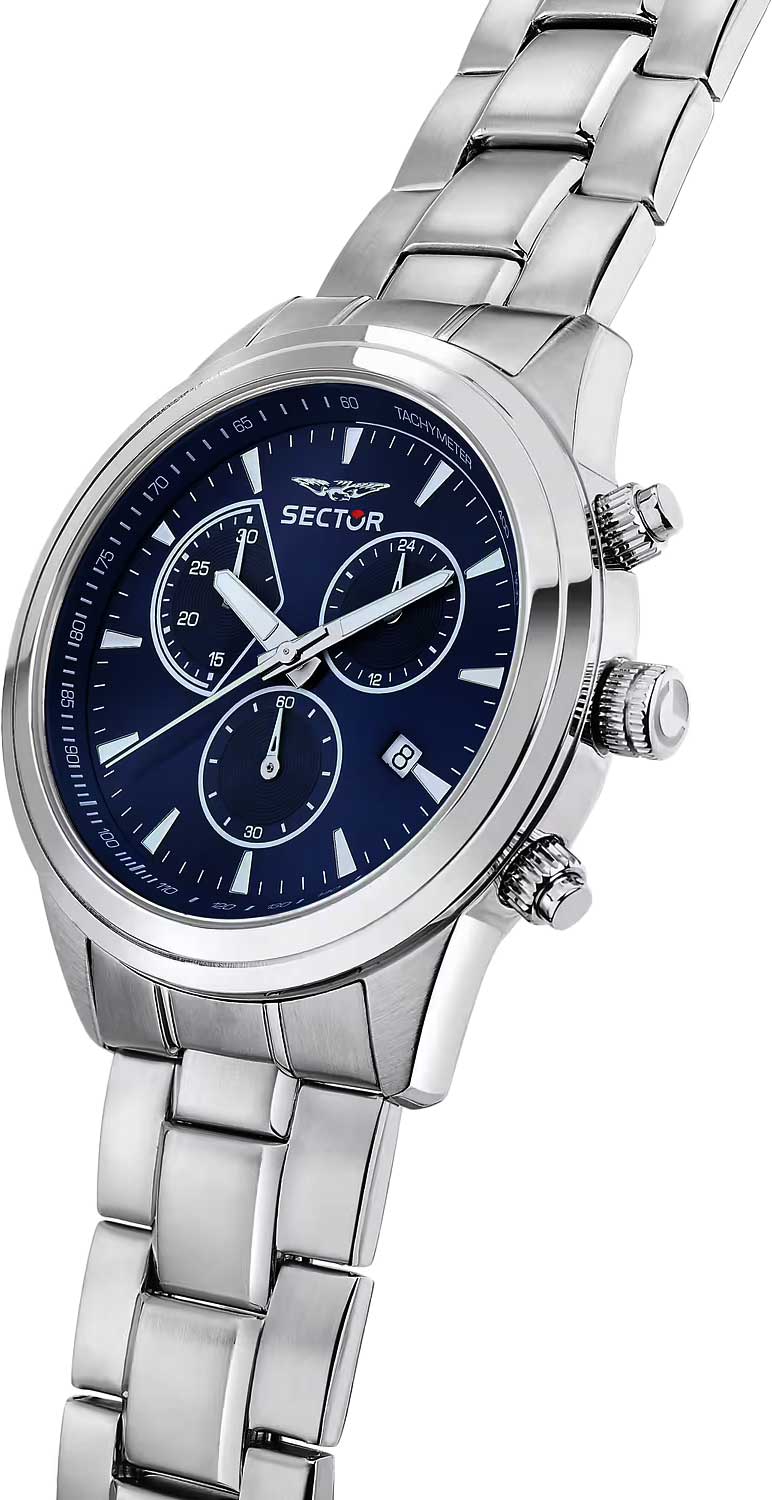 Часы-хронограф с секундомером и тахиметром. Ретроградный указатель минут хронографа до 30мин. 12-ти и 24-х часовой формат времени. Циферблат с метками в виде штрихов выполнен по технологии Sunray (солнечные лучи). Окошко даты находится в положении 4 часа. Браслет с раскладывающейся застежкой. Застежка с системой блокировки.