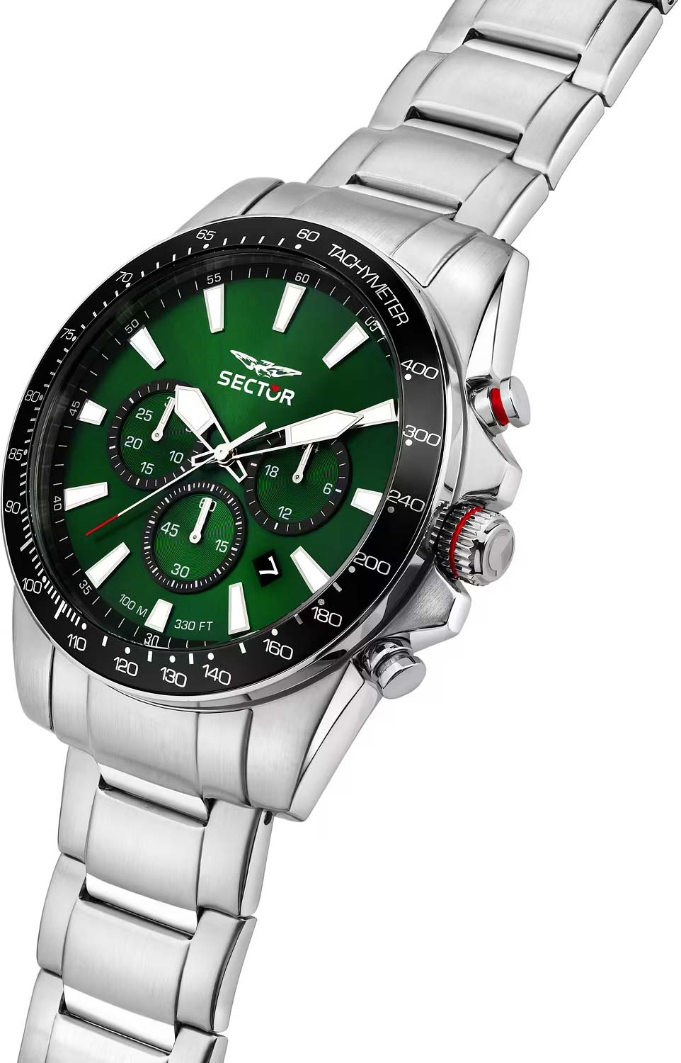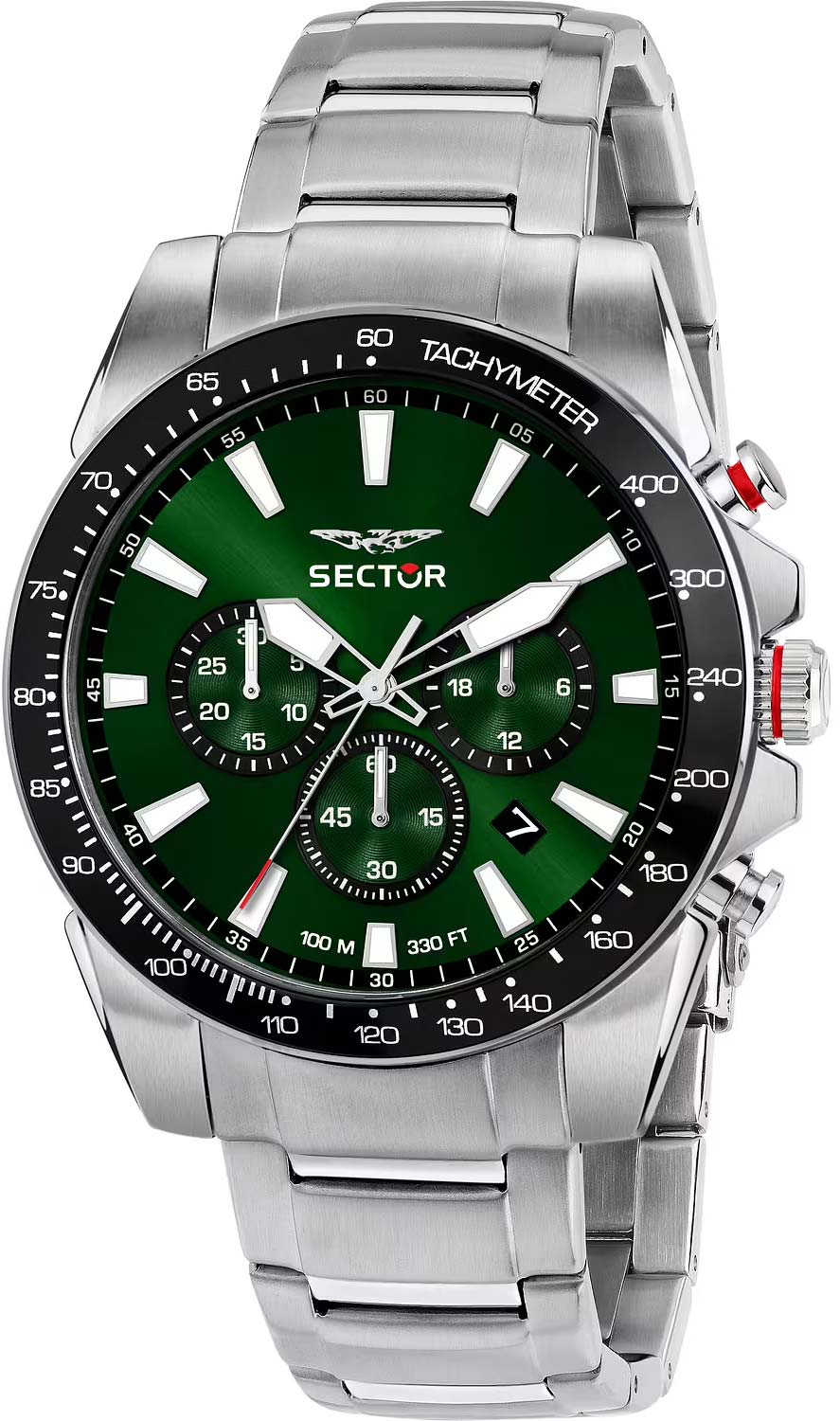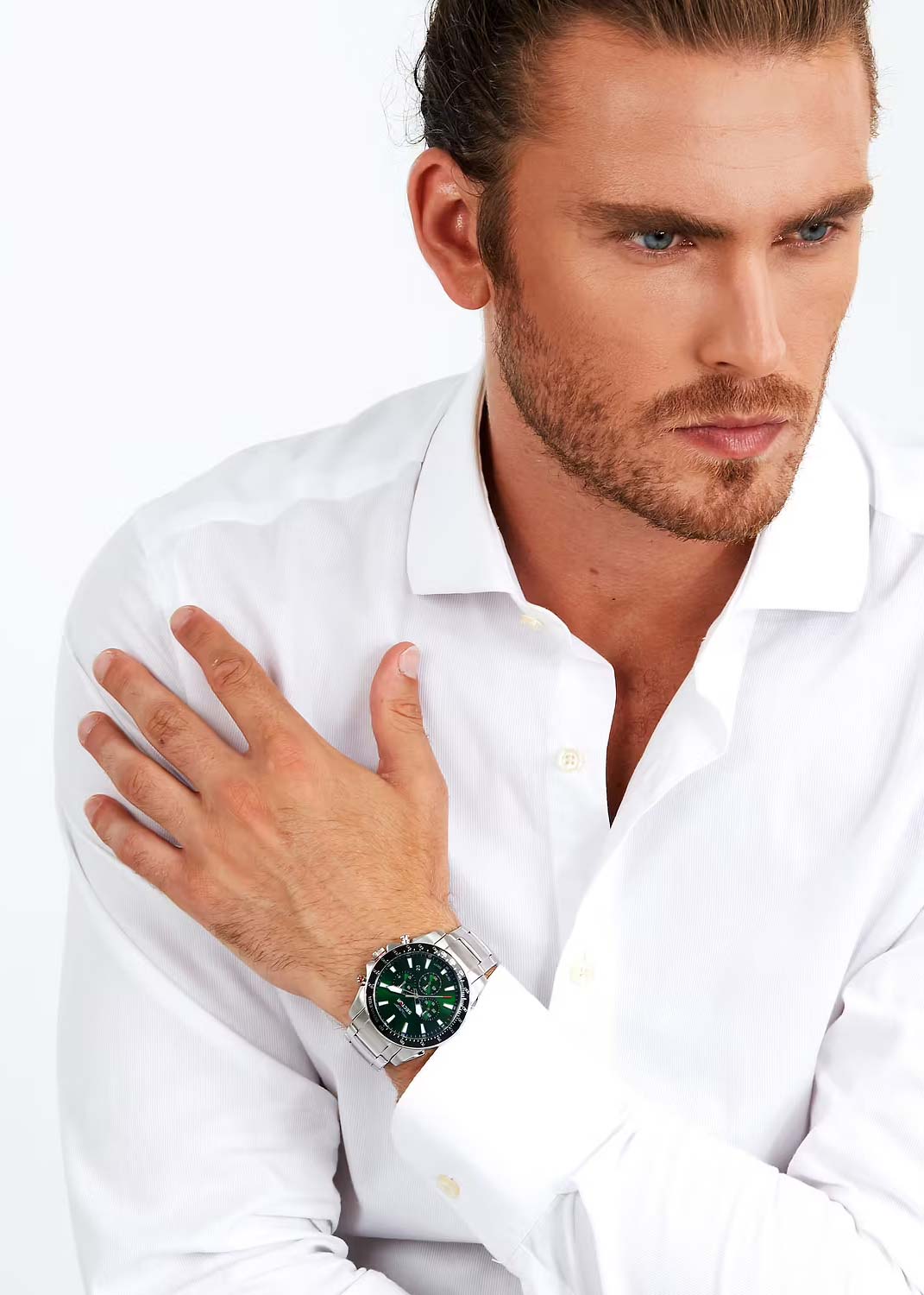Часы-хронограф с секундомером и тахиметром. 12-ти и 24-х часовой формат времени. Циферблат с метками в виде штрихов выполнен по технологии Sunray (солнечные лучи). Окошко даты находится в положении между отметками 4 и 5 часов. Заводная головка с защитой. Браслет с раскладывающейся застежкой. Застежка с системой блокировки.