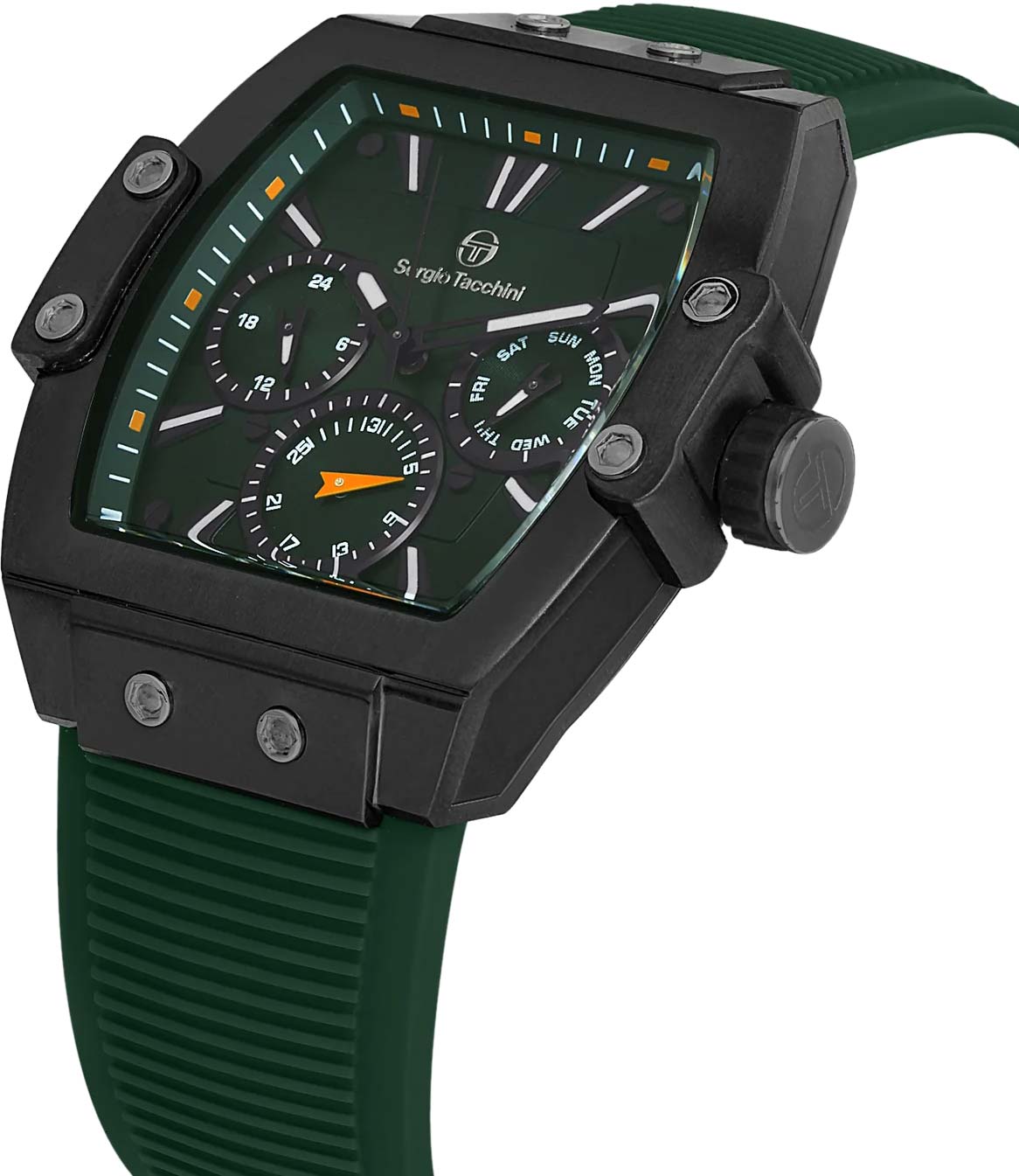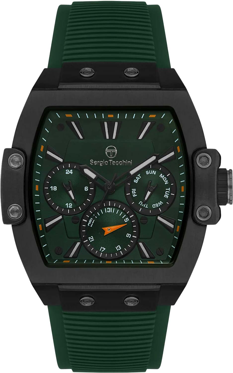 Необходимый набор функций и современный дизайн - идеальный вариант для ежедневного использования. Наручные часы. Бочкообразный стальной корпус с сатинированной поверхностью дополнен винтами. 12-ти и 24-х часовой формат времени. Дата и день недели отображаются на отдельных циферблатах. Метки в виде штрихов. Рифленая заводная головка с защитой. Удобный силиконовый ремешок. Производитель оставляет за собой право вносить изменения во внешний вид часов.