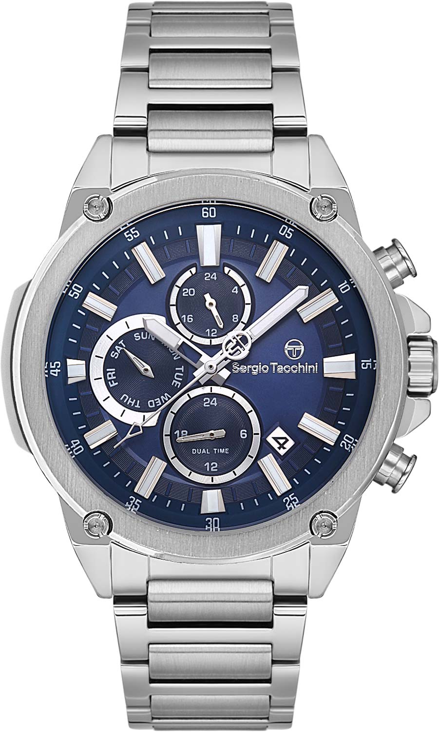 Безупречный аксессуар, наделенный широким функционалом - идеальная составляющая городского стиля современного мужчины. Наручные кварцевые часы. Круглый стальной корпус. Метки в виде штрихов. Заостренные прямоугольные стрелки в стиле Baton. 12-ти и 24-х часовой формат времени. Второй часовой пояс в 24-х часовом формате времени. День недели вынесен на отдельный циферблат. Окошко даты находится между отметками 4 и 5 часов. Рифленая заводная головка с защитой. Надежный стальной браслет с раскладывающейся застежкой. Производитель оставляет за собой право вносить изменения во внешний вид часов.