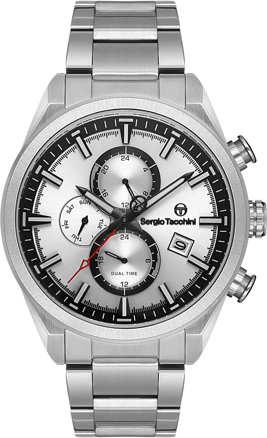 Функциональный и практичный аксессуар от Sergio Tacchini - то, чего достоин каждый мужчина. Наручные кварцевые часы. 12-ти и 24-х часовой формат времени. Второй часовой пояс в 24-х часовом формате времени. Циферблат с метками в виде штрихов выполнен по технологии Sunray (солнечные лучи). День недели вынесен на отдельный циферблат. Окошко даты находится в положении 4 часа. Рифленая заводная головка. Браслет с раскладывающейся застежкой. Производитель оставляет за собой право вносить изменения во внешний вид часов.