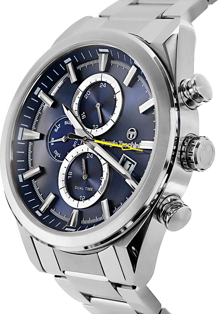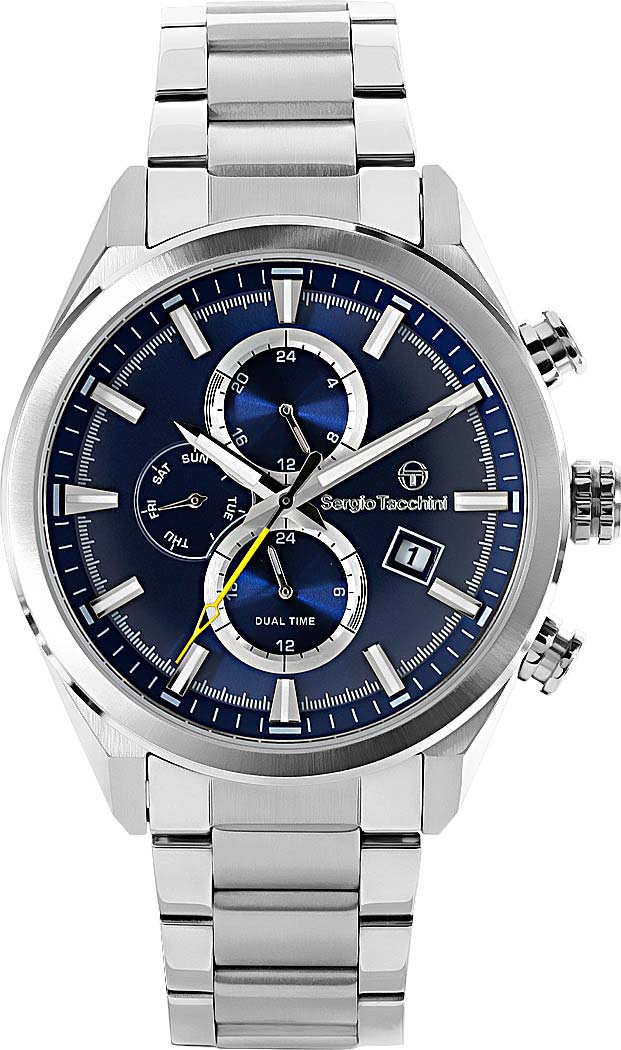 Функциональные и практичные часы от Sergio Tacchini - аксессуар, которого достоин каждый мужчина. Мужские часы. 12-ти и 24-х часовой формат времени. Второй часовой пояс в 24-х часовом формате времени. Метки в виде штрихов. День недели вынесен на отдельный циферблат. Окошко даты находится в положении 4 часа. Браслет с раскладывающейся застежкой. Производитель оставляет за собой право вносить изменения во внешний вид часов.