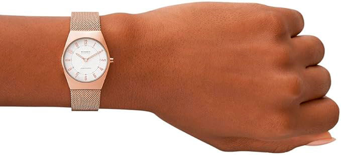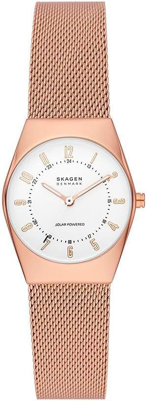 Женские часы Grenen Lille. Питание от солнечной энергии. Запас хода 6 месяцев. Циферблат выполнен по технологии Sunray (солнечные лучи). Метки в виде арабских цифр. Стрелки и метки с люминесцентным покрытием, которое светится в темноте после непродолжительной зарядки на свету. Стальной браслет миланского плетения.