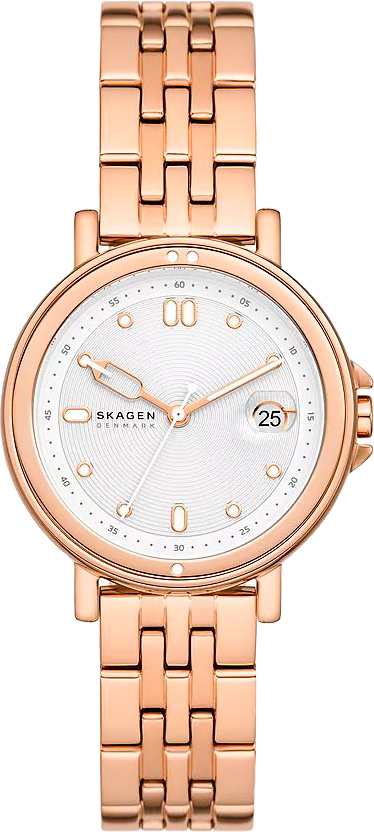 Стильные женские часы в минималистичном дизайне станут отражением вашего уникального стиля и безупречного вкуса. Женские кварцевые часы Signatur Lille Sport. Круглый стальной корпус с IP покрытием цвета розового золота. Белый циферблат с радиальным узором защищен минеральным стеклом. Метки в виде точек и штрихов. По краю циферблата нанесена минутная шкала. Стрелки и метки с люминесцентным покрытием, которое светится в темноте после непродолжительной зарядки на свету. Окошко даты с увеличительным стеклом находится в положении 3 часа. Гладкая заводная головка с защитой. Стальной браслет с IP покрытием цвета розового золота и раскладывающейся застежкой.