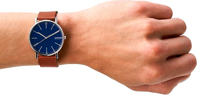 Мужские кварцевые часы Signatur. Круглый стальной корпус. Метки в виде штрихов. Гладкая заводная головка. Кожаный ремешок с классической застежкой.