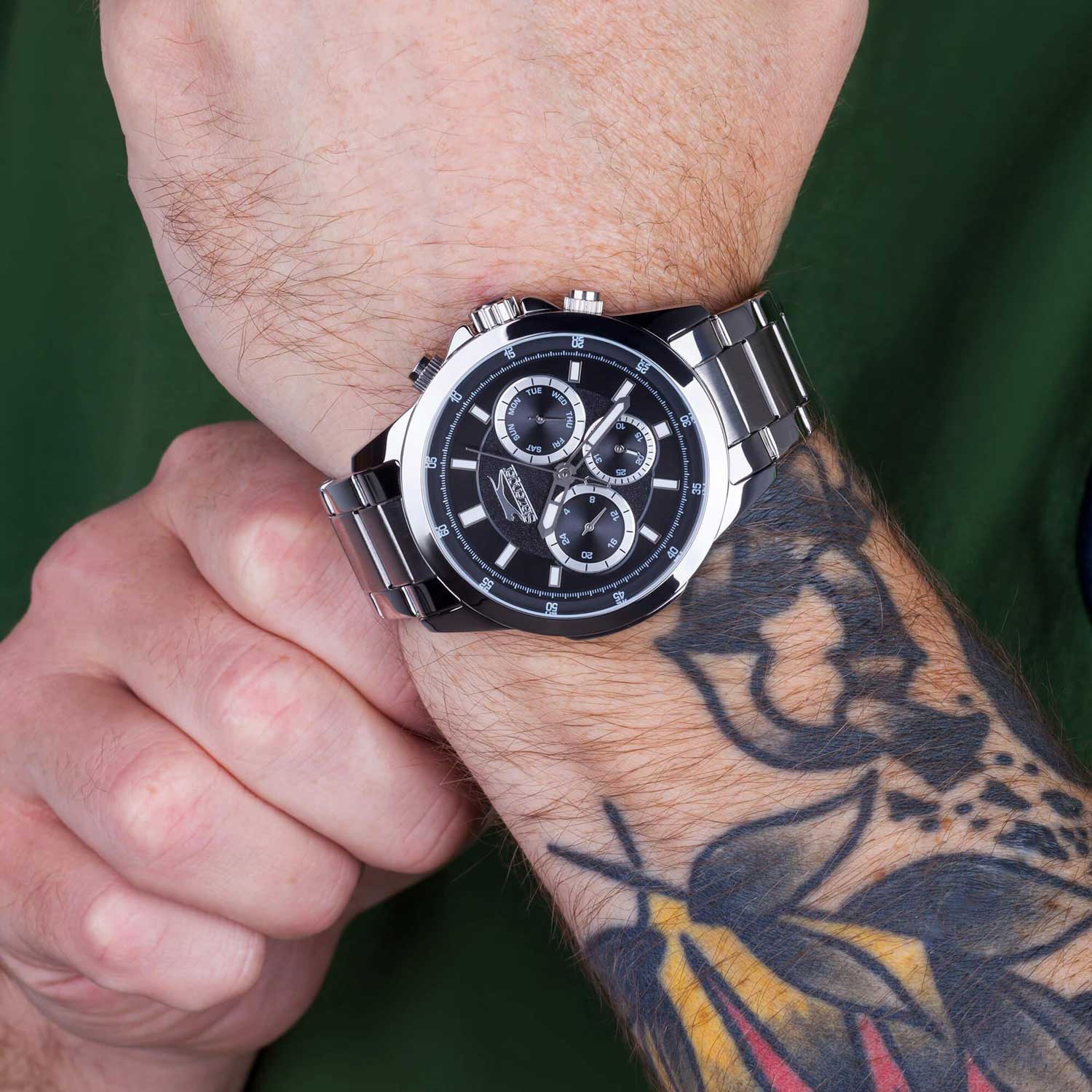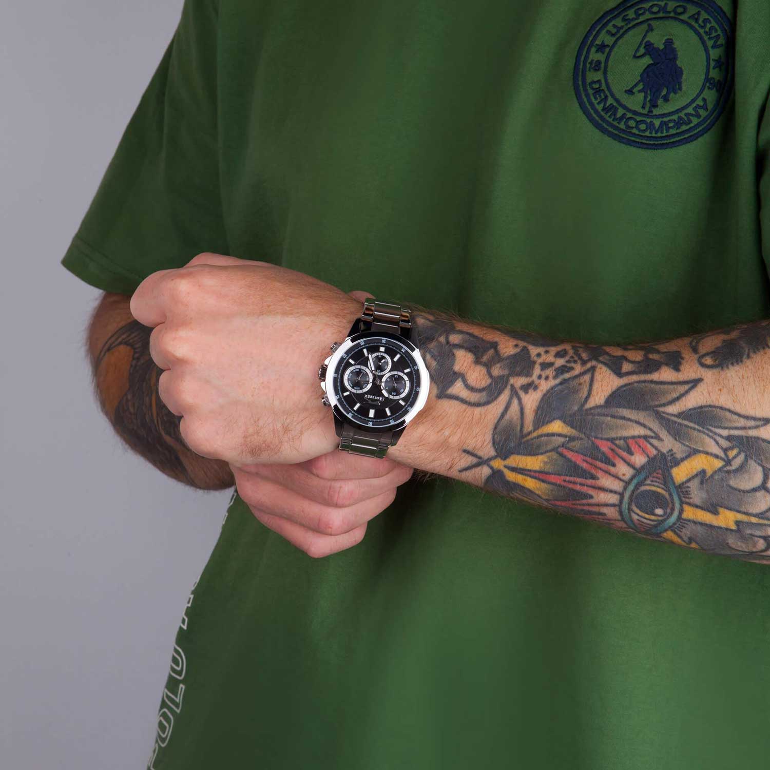 Неповторимый и стильный аксессуар, дополняющий любой повседневный наряд. Мужские наручные кварцевые часы. Круглый корпус из суперметалла, который прочнее других сплавов. 12-ти и 24-х часовой формат времени. Циферблат с метками в виде штрихов украшен логотипом бренда. Время в 24-х часовом формате времени, число и день недели отображаются на отдельных циферблатах. Рифленая заводная головка с защитой. Браслет с раскладывающейся застежкой.