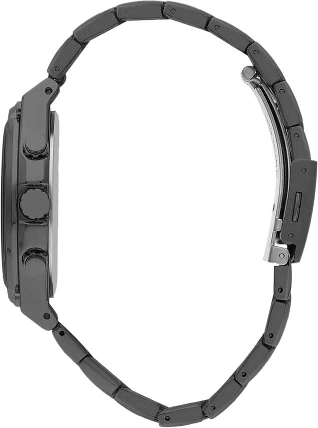 Многофункциональный аксессуар станет хорошим компаньоном на каждый день. Мужские наручные кварцевые часы. Круглый корпус из суперметалла, который прочнее других сплавов. Безель с 4 декоративными винтами. 12-ти и 24-х часовой формат времени. Циферблат с метками в виде штрихов украшен логотипом бренда. Время в 24-х часовом формате времени, число и день недели отображаются на отдельных циферблатах. Рифленая заводная головка с защитой. Браслет с раскладывающейся застежкой.