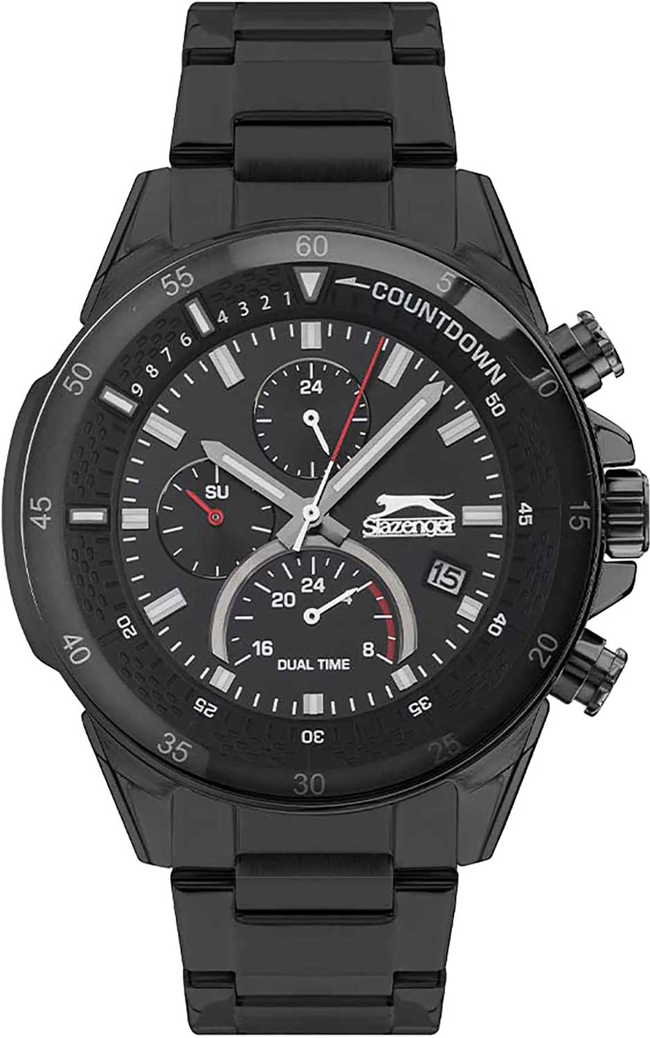 Этот стильный аксессуар придаст уверенности и решимости в любой ситуации. Мужские наручные кварцевые часы. Круглый корпус из суперметалла, который прочнее других сплавов. 12-ти и 24-х часовой формат времени. Второй часовой пояс в 24-х часовом формате времени. Обратный отсчет времени. Циферблат с метками в виде штрихов украшен логотипом бренда. Окошко даты находится в положении 4 часа. Время в 24-х часовом формате времени, день недели и второй часовой пояс отображаются на отдельных циферблатах. Рифленая заводная головка с защитой. Браслет с раскладывающейся застежкой.