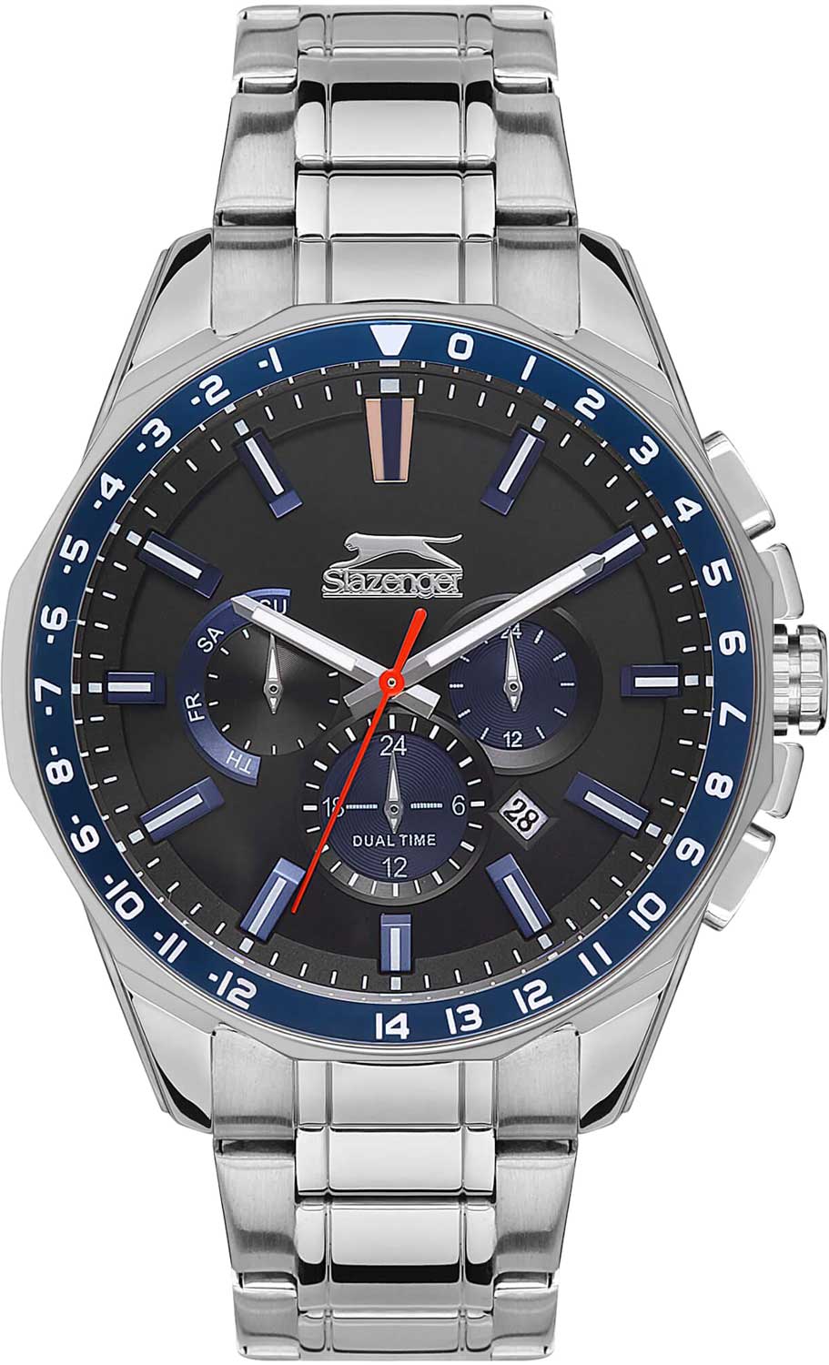 Классические черты в сочетании с оригинальным исполнением - выбор, подчеркивающий вашу индивидуальность. Мужские наручные кварцевые часы. Круглый корпус из суперметалла, который прочнее других сплавов. 12-ти и 24-х часовой формат времени. Второй часовой пояс в 24-х часовом формате времени. Циферблат с метками в виде штрихов выполнен по технологии Sunray (солнечные лучи) и украшен логотипом бренда. Окошко даты находится между отметками 4 и 5 часов. Время в 24-х часовом формате времени, день недели и второй часовой пояс отображаются на отдельных циферблатах. Рифленая заводная головка с защитой. Браслет с раскладывающейся застежкой.