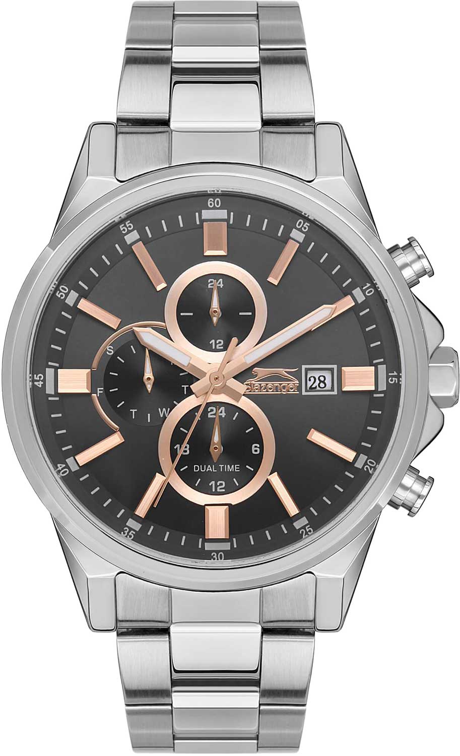 Стильный мужской аксессуар будет прекрасным партнером в вопросах времени. Наручные кварцевые часы. Круглый корпус из суперметалла, который прочнее других сплавов. 12-ти и 24-х часовой формат времени. Второй часовой пояс в 24-х часовом формате времени. Циферблат с метками в виде штрихов выполнен по технологии Sunray (солнечные лучи) и украшен логотипом бренда. Окошко даты находится в положении 3 часа. Время в 24-х часовом формате времени, день недели и второй часовой пояс отображаются на отдельных циферблатах. Шестигранная заводная головка с защитой. Браслет с раскладывающейся застежкой.