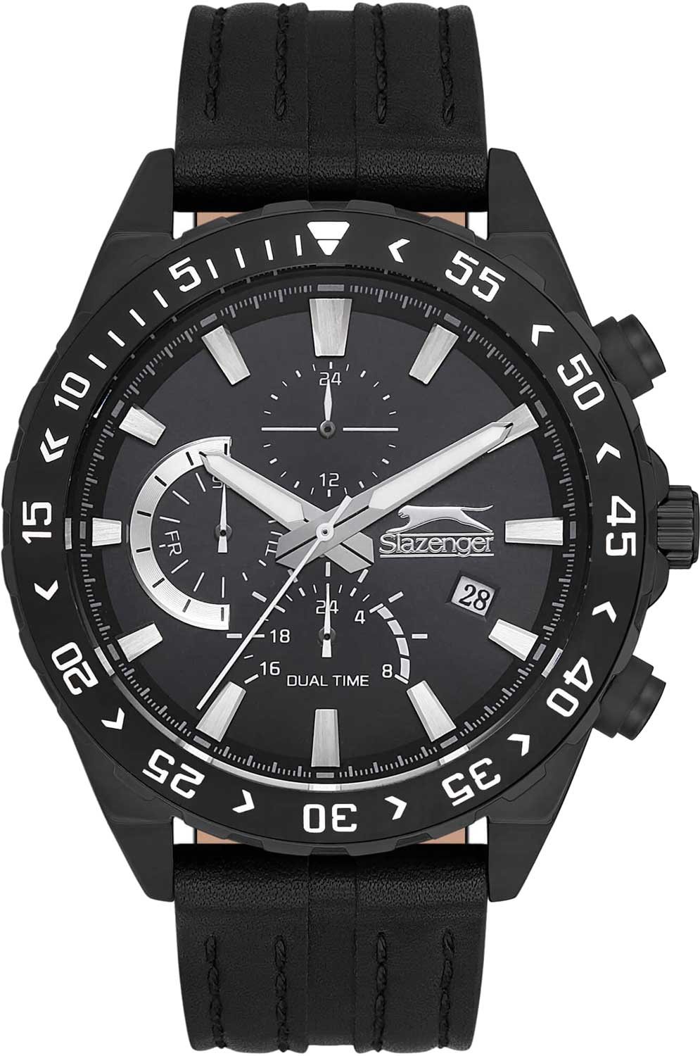 Стильный аксессуар от Slazenger раскроет мужественный характер своего обладателя. Наручные кварцевые часы. Круглый корпус из суперметалла, который прочнее других сплавов. 12-ти и 24-х часовой формат времени. Второй часовой пояс в 24-х часовом формате времени. Циферблат с метками в виде штрихов выполнен по технологии Sunray (солнечные лучи) и украшен логотипом бренда. Окошко даты находится в положении 4 часа. Время в 24-х часовом формате времени, день недели и второй часовой пояс отображаются на отдельных циферблатах. Рифленая заводная головка с защитой. Удобный кожаный ремешок с классической застежкой.