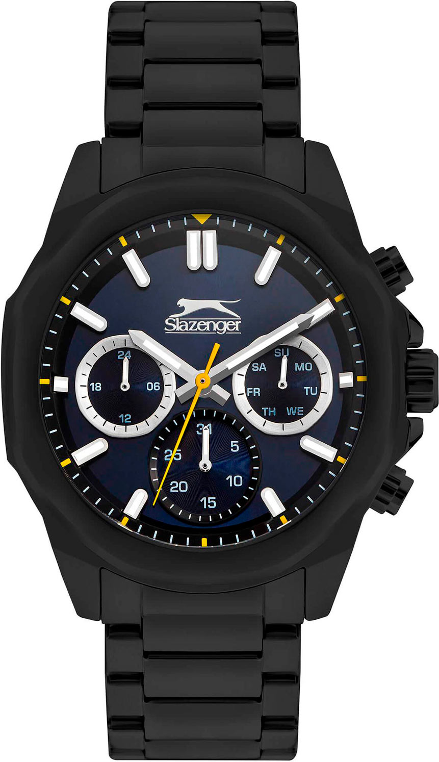 С этими интересными и элегантными часами вы будете демонстрировать стиль и уверенность в каждом движении. Мужские кварцевые часы с корпусом из суперметалла с черным IP покрытием. Циферблат с логотипом бренда и метками в виде штрихов защищен выпуклым минеральным стеклом. Дата, день недели, 12-ти и 24-х часовой формат времени вынесены на отдельные циферблаты. Заводная головка с защитой. Надежный браслет из суперметалла с черным IP покрытием и раскладывающейся застежкой.
