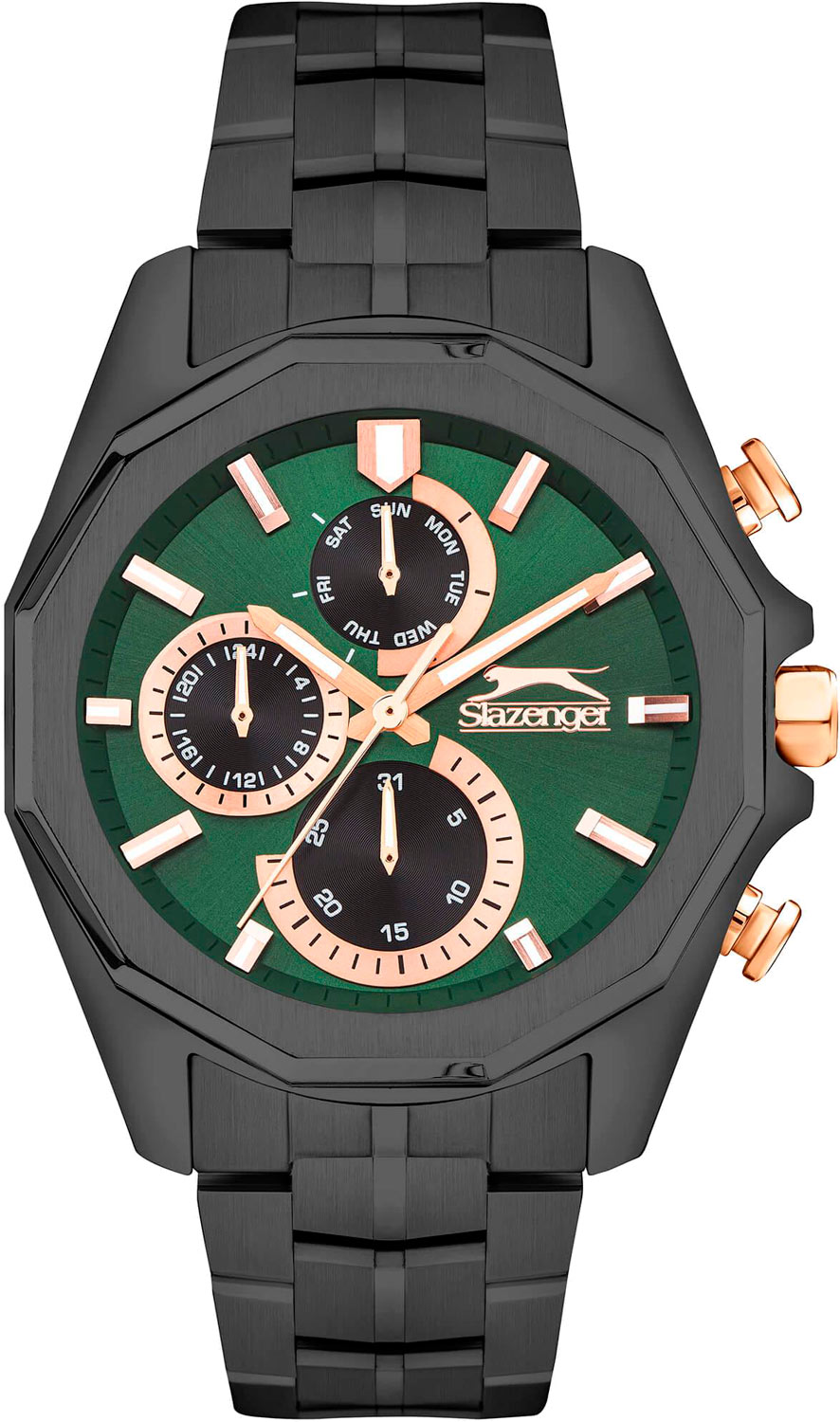 Надежные и функциональные часы добавят завершенности вашему образу, подчеркнув ваше чувство стиля и утонченный вкус. Мужские кварцевые часы с корпусом из суперметалла с черным IP покрытием. Сатинированный безель. Зеленый циферблат с логотипом бренда и метками в виде штрихов защищен минеральным стеклом. Дата, день недели, 12-ти и 24-х часовой формат времени вынесены на отдельные циферблаты. Граненая заводная головка с защитой. Надежный сатинированный браслет из суперметалла с черным IP покрытием и раскладывающейся застежкой.