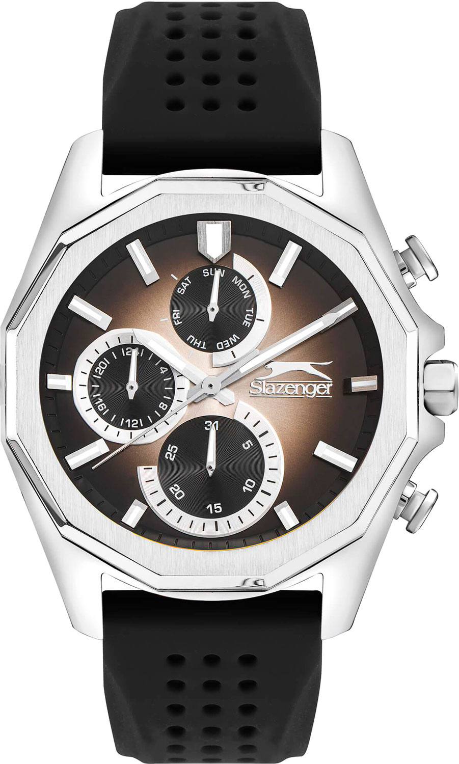 Стильные наручные часы гармонично дополнят мужской образ, подчеркивая безупречный вкус своего обладателя. Мужские кварцевые часы с корпусом из суперметалла. Сатинированный безель. Градиентный циферблат с логотипом бренда и метками в виде штрихов защищен минеральным стеклом. Дата, день недели, 12-ти и 24-х часовой формат времени вынесены на отдельные циферблаты. Граненая заводная головка с защитой. Перфорированный силиконовый ремешок с классической застежкой.