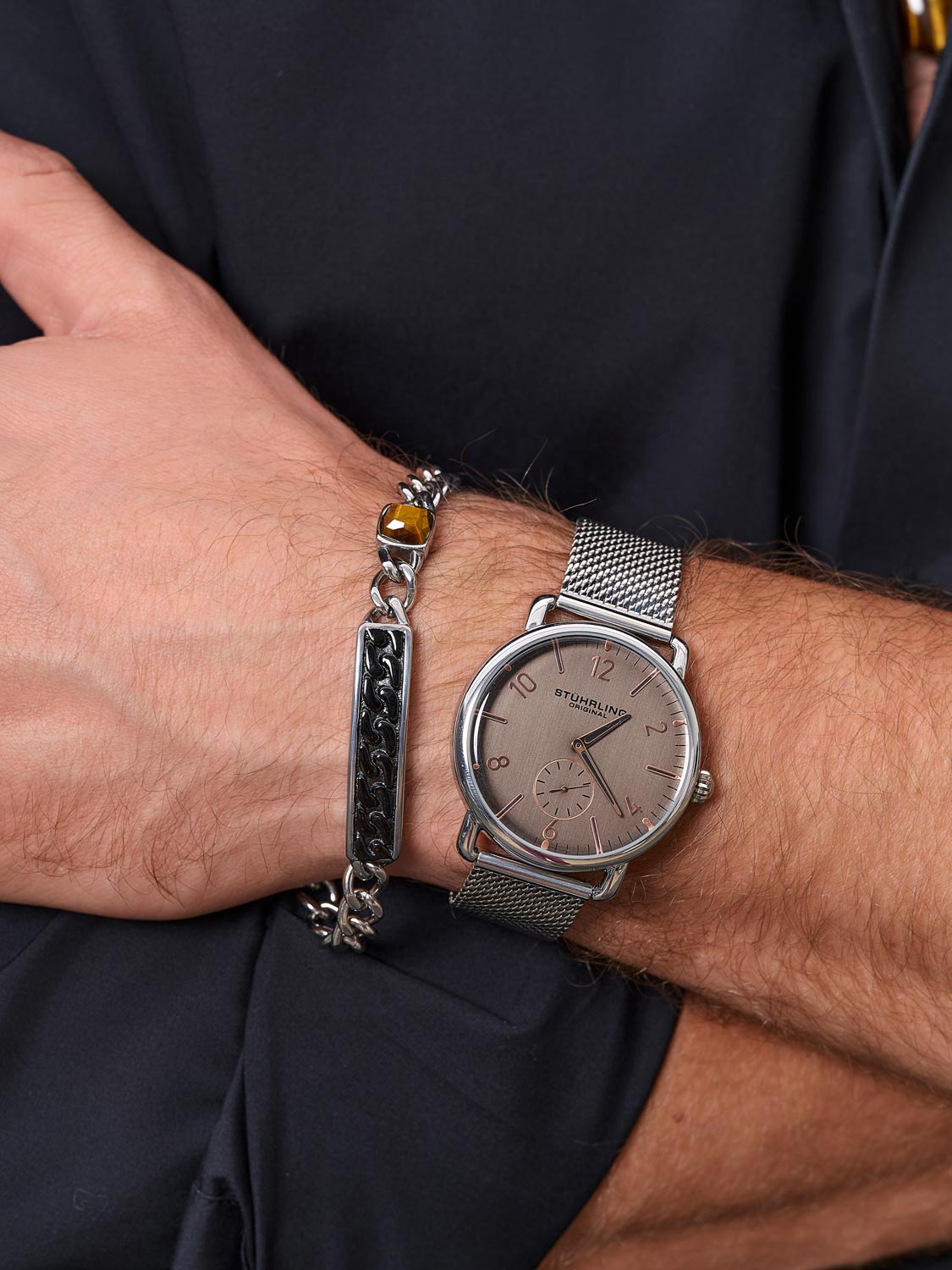 Мужские часы с легко читаемым циферблатом - отличный вариант повседневного аксессуара. Мужские кварцевые часы Jenson. Круглый полированный корпус. Накладные метки в виде штрихов и арабских цифр. Скелетонизированные клиновидные стрелки в стиле Dauphine. Секундная стрелка вынесена на отдельный циферблат. Рифленая заводная головка в виде луковицы. Завинчивающаяся задняя крышка из нержавеющей стали. Стальной браслет миланского плетения.