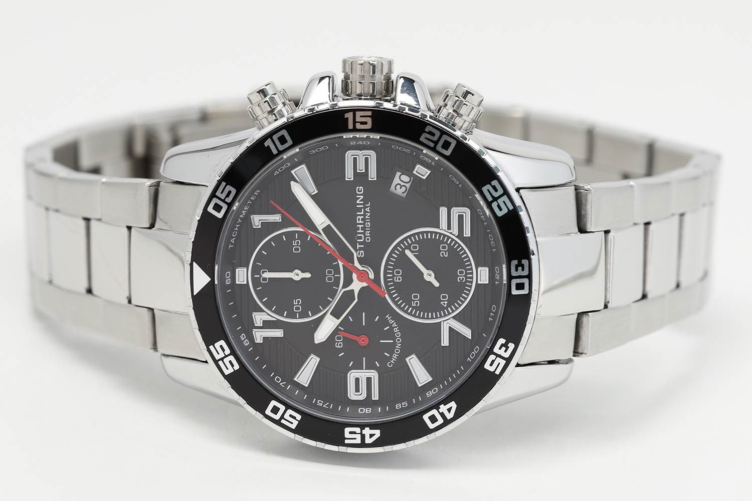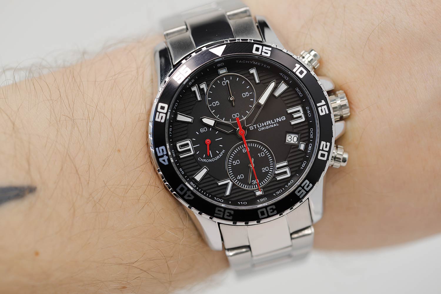 Отличное сочетание стиля, качества и функциональности. Часы для практичных мужчин. Concorso. Часы-хронограф с секундомером. Накладные метки в виде штрихов и арабских цифр. Окошко даты находится в положении 4 часа. Завинчивающаяся заводная головка с защитой. Завинчивающаяся задняя крышка украшена гравировкой Stuhrling. Браслет с раскладывающейся застежкой. Застежка с системой блокировки.