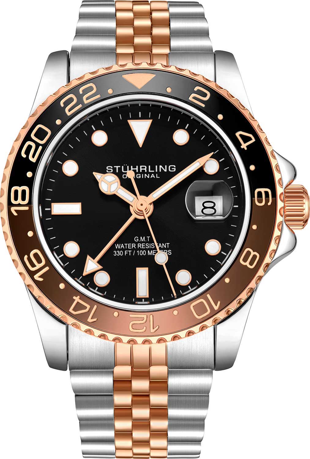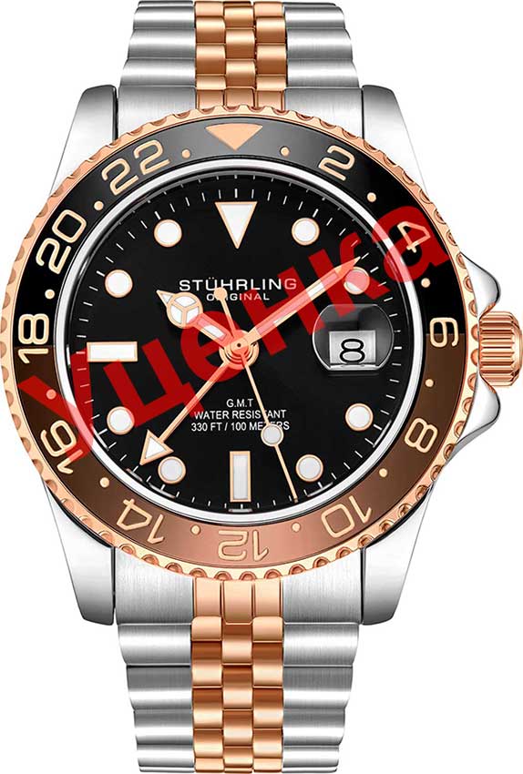 Meridian. Мужские часы. Второй часовой пояс в 24-х часовом формате времени, отображается центральной стрелкой. Шкала для второго пояса расположена на вращающемся безеле. Метки в виде точек и штрихов. Окошко даты с увеличительным стеклом в позиции 3 часа. Завинчивающаяся задняя крышка и заводная головка с защитой. Браслет с раскладывающейся застежкой. Застежка с системой блокировки.