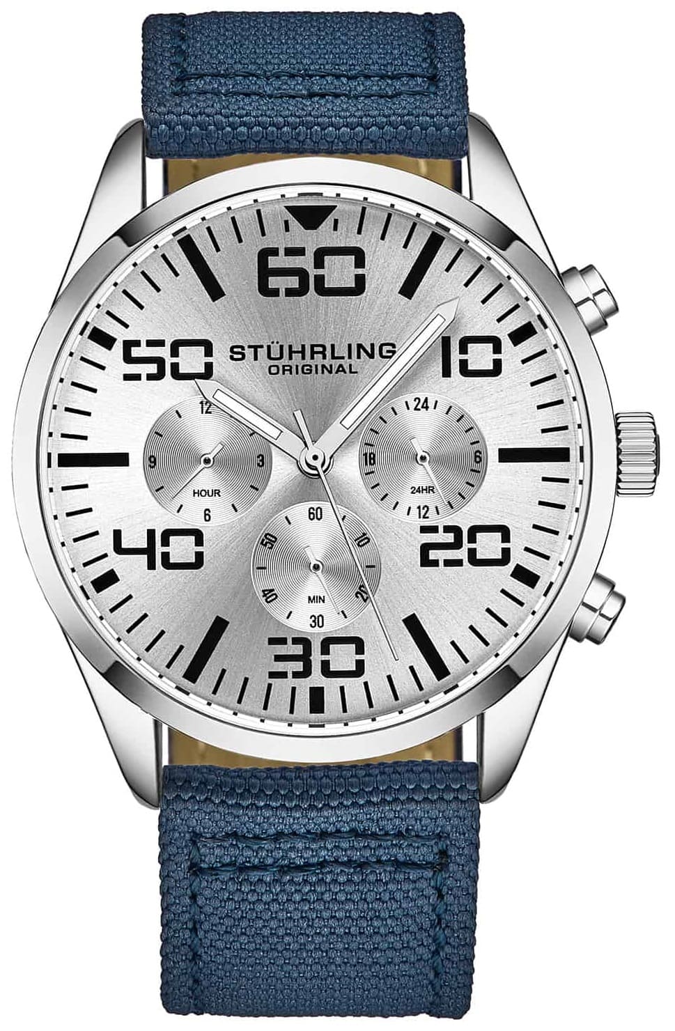 Удобный и практичный хронограф от Stuhrling - то, что просто необходимо настоящему мужчине. Stuhrling Original Aviator. Часы-хронограф с секундомером. 12-ти и 24-х часовой формат времени. Циферблат выполнен по технологии Sunray (солнечные лучи). Метки в виде штрихов и арабских цифр. Завинчивающаяся задняя крышка. Ремешок с классической застежкой.