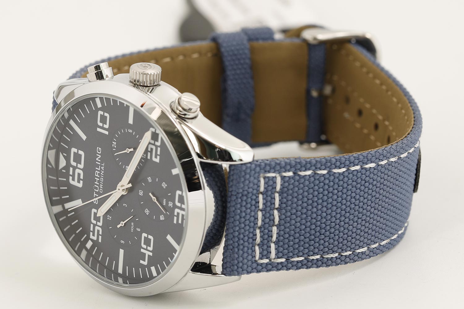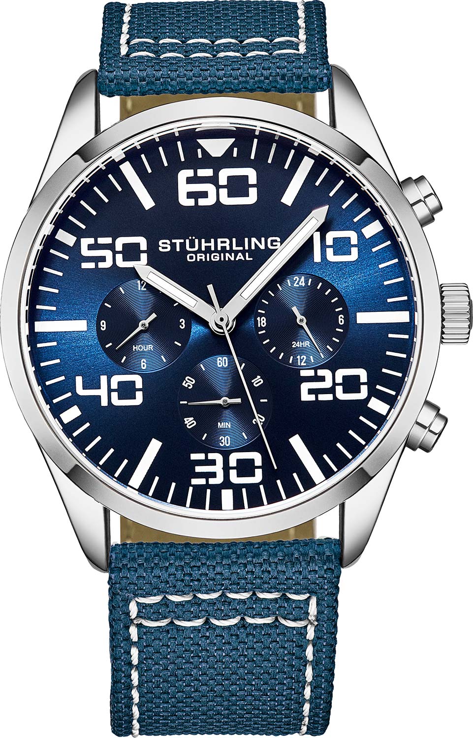Удобный и практичным хронограф от Stuhrling то, что просто необходимо настоящему мужчине. Aviator. Часы-хронограф с секундомером. 12-ти и 24-х часовой формат времени. Циферблат выполнен по технологии Sunray (солнечные лучи). Метки в виде штрихов и арабских цифр. Завинчивающаяся задняя крышка. Ремешок с классической застежкой.