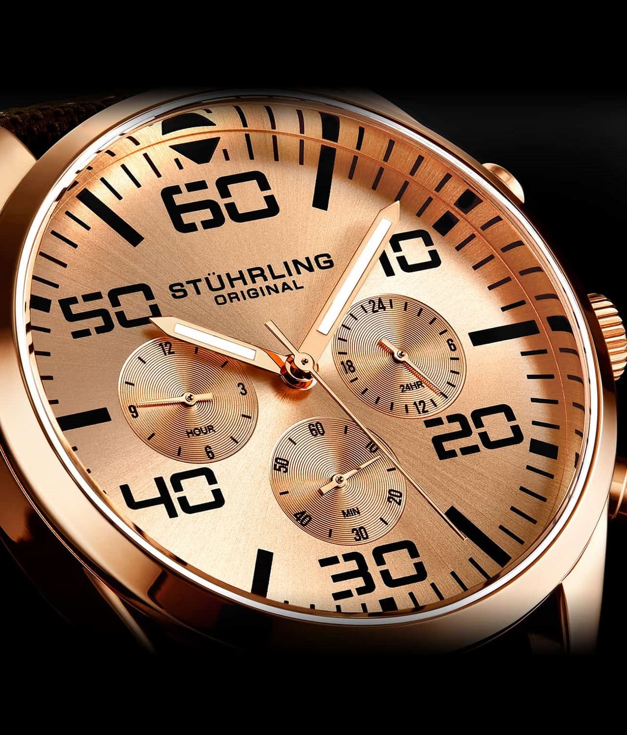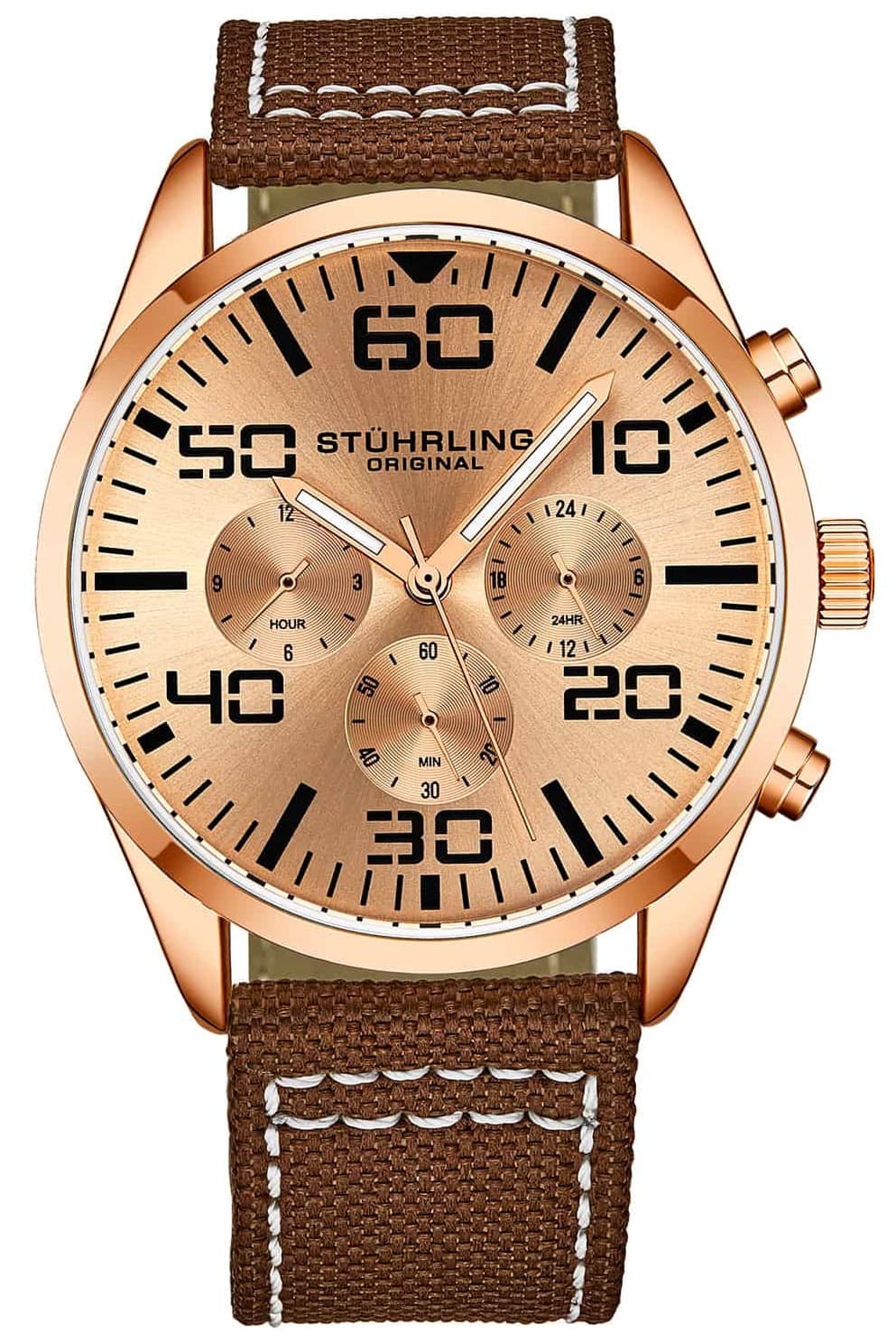 Удобный и практичный хронограф от Stuhrling - то, что просто необходимо настоящему мужчине. Stuhrling Original Aviator. Часы-хронограф с секундомером. 12-ти и 24-х часовой формат времени. Циферблат выполнен по технологии Sunray (солнечные лучи). Метки в виде штрихов и арабских цифр. Завинчивающаяся задняя крышка. Ремешок с классической застежкой.