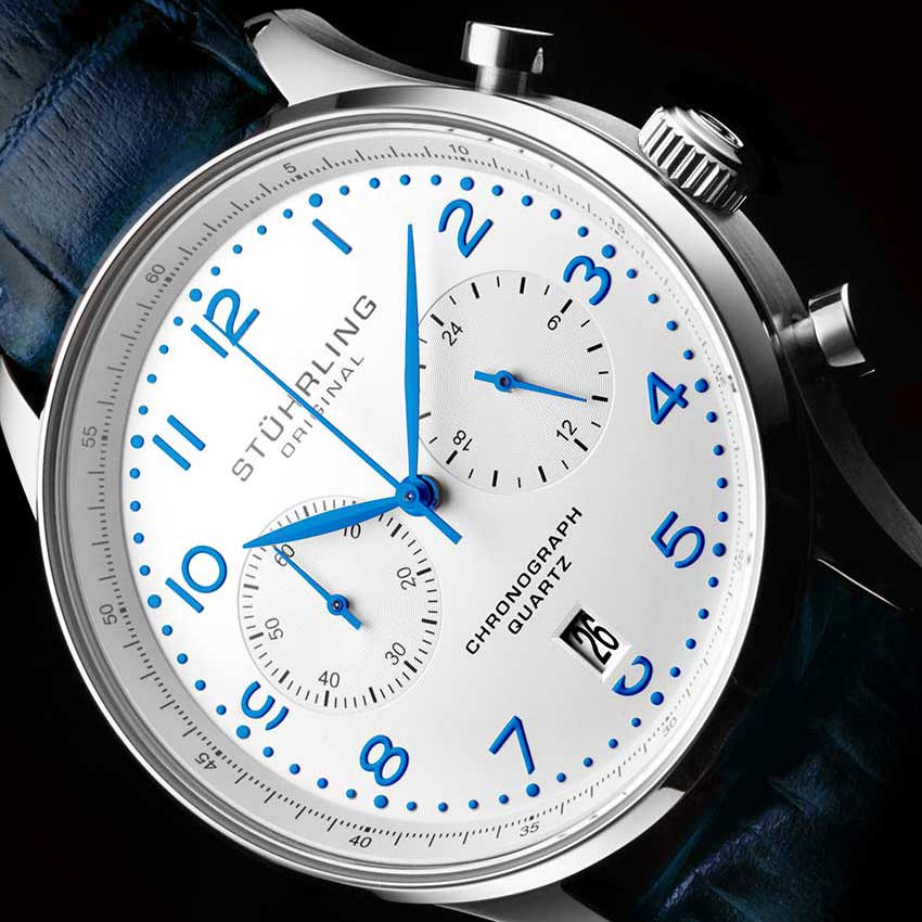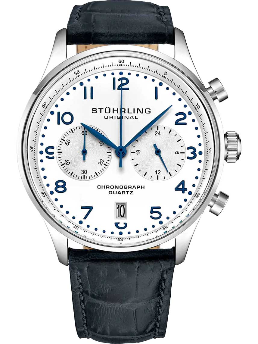 Хронограф от компании Stuhrling станет незабываемым подарком для поклонников стильных часов. GR1-Q. Часы-хронограф с секундомером. Циферблат выполнен по технологии Sunray (солнечные лучи). Накладные метки в виде арабских цифр. Окошко даты находится в положении 6 часов. Завинчивающаяся задняя крышка. Ремешок с классической застежкой.