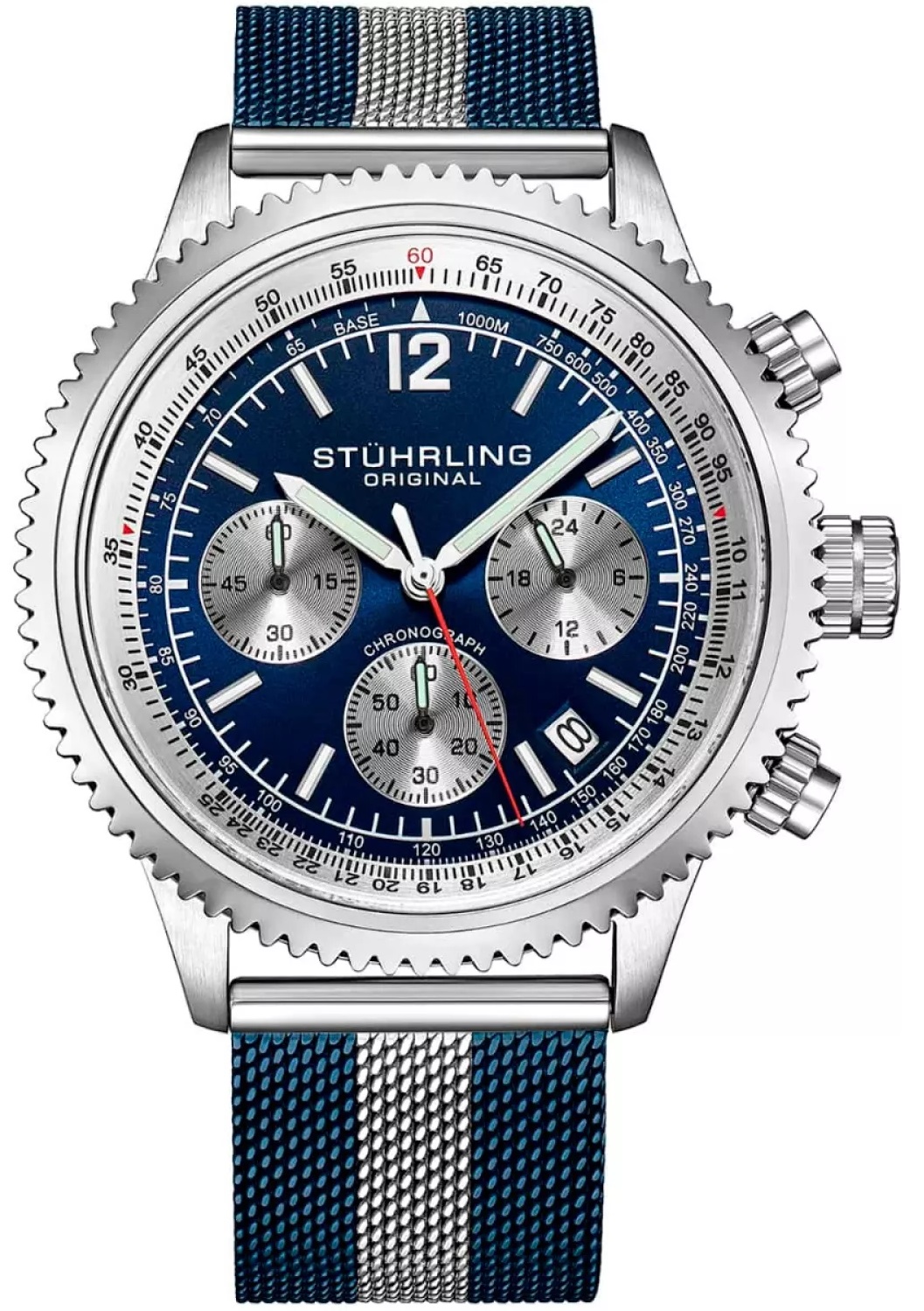 Изысканный и экстравагантный дизайн – отличный вариант часов для респектабельного мужчины. Часы-хронограф с секундомером и тахиметром. Накладные метки в виде штрихов. Рифленая заводная головка. Окошко даты. Миланский браслет.